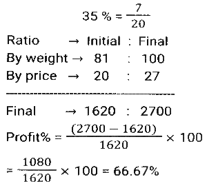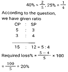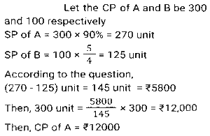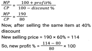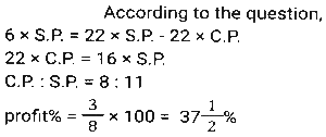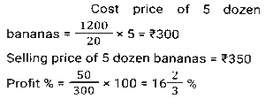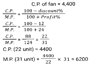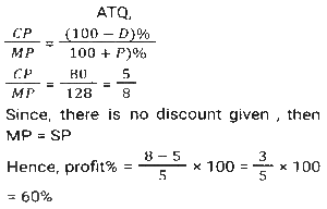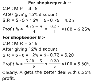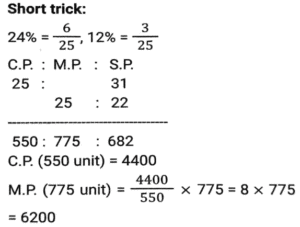 Profit and Loss (SSC) (Part-3)Total Questions: 5041. By selling 22 items, Rohit gains the selling price of 6 items. His gain percent is: [SSC CHSL 09/07/2024 (4th Shift)](a) 37½ %(b) 37⅓ %(c) 33½ %(d) 33⅓ %Correct Answer: (a) 37½ %Solution:42. A shopkeeper sells an item at 20% discount on the marked price and earns a profit of 90%. If he sells the same item at 40% discount, then his new profit percentage will be: [SSC CHSL 09/07/2024 (4th Shift)](a) 48.2%(b) 45.8%(c) 42.5%(d) 41.8%Correct Answer: (c) 42.5%Solution:43. A vendor sells his goods using weights 19% less than true weights and makes a profit of 35%. His net gain percentage (rounded off to 2 decimal places) is: [SSC CHSL 10/07/2024 (1st Shift)](a) 81.33%(b) 66.33%(c) 81.67%(d) 66.67%Correct Answer: (d) 66.67%Solution:44. Shopkeeper A marks up his price for an item at 25% and offers a discount of 15%. The same item is marked at 20% by another shopkeeper B and sold at a discount of 12%. Who gets a better deal in terms of % profit and by what profit percentage he sells that item? [SSC CHSL 10/07/2024 (2nd Shift)](a) A by 0.55%(b) B by 0.65%(c) B by 5.6%(d) A by 6.25%Correct Answer: (d) A by 6.25%Solution:45. A vendor buys 20 dozen bananas for 1,200 and sells 5 dozen for ₹350, then his gain percentage is: [SSC CHSL 10/07/2024 (2nd Shift)](a) 15⅓ %(b) 16⅔ %(c) 13⅔ %(d) 21⅓ %Correct Answer: (b) 16⅔ %Solution:46. A merchant sells 195 kg of wheat for ₹10,260 at a profit of ₹4.50 per kg of wheat. What is the cost price (in₹, to the nearest integer) of 15 kg of wheat? [SSC CHSL 10/07/2024 (3rd Shift)](a) 682(b) 750(c) 722(d) 595Correct Answer: (c) 722Solution:47. A costs thrice as much as B. A is sold at a loss of 10%, and B is sold at 5/4 of its own price. If the selling price of A is 5,800 more than the selling price of B, then the cost price of A is: [SSC CHSL 10/07/2024 (4th Shift)](a) ₹12,000(b) ₹9,600(c) ₹15,000(d) ₹4,000Correct Answer: (a) ₹12,000Solution:48. By selling an article for ₹2,160, Prashant allows a 20% discount and earns 28% profit. If the article is sold without any discount, the profit will be: [SSC CHSL 11/07/2024 (1st Shift)](a) 50%(b) 55%(c) 65%(d) 60%Correct Answer: (d) 60%Solution:49. A shopkeeper sells goods at 40% loss on cost price but uses 25% less weight. What is his percentage profit or loss? [SSC CHSL 11/07/2024 (1st Shift)](a) Loss, 10%(b) Profit, 10%(c) Loss, 20%(d) Profit, 20%Correct Answer: (c) Loss, 20%Solution:50. The cost price of a fan is ₹4,400. A merchant wants to make a 24% profit by selling it. At the time of sale, merchant declares a discount of 12% on the marked price. Find the marked price. [SSC CHSL 11/07/2024 (3rd Shift)](a) ₹6,020(b) ₹2,060(c) ₹2,600(d) ₹6,200Correct Answer: (d) ₹6,200Solution:Submit Quiz« Previous12345