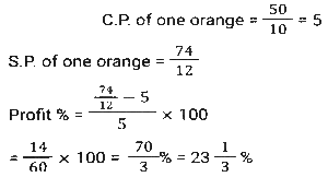 8. A shopkeeper buys oranges at the rate of 10 oranges for ₹50 and sells them at the rate of 12 oranges for ₹74. Find his gain or loss percentage. [SSC CPO 28/06/2024 (1st Shift)]