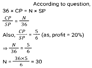 2. The cost price of 36 articles is the same as the selling price of N articles. If the profit is 20%, then the value of N is: [SSC CPO 27/06/2024 (1st Shift)]