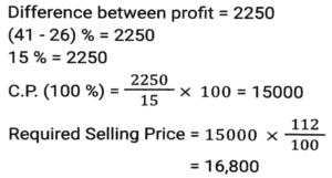 1. A shopkeeper sold an article at a 26% profit. On selling it for ₹2,250 more, he would get a profit of 41%. If this article is sold at 12% profit, then the selling price would be: [SSC CHSL 11/07/2024 (3rd Shift)]