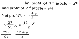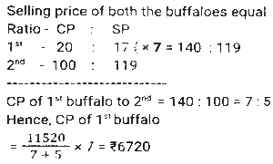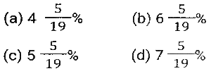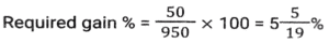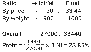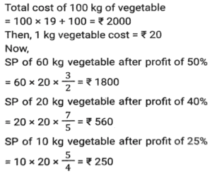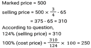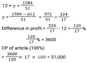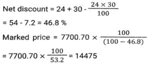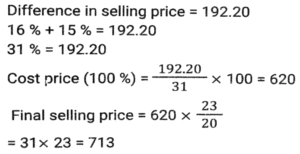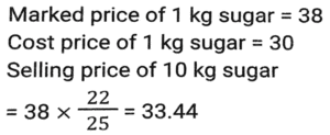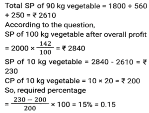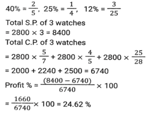 Profit and Loss (SSC) (Part-4)Total Questions: 5011. A shopkeeper gives a discount of 12% on the purchase of 10 kg of sugar. The cost price of the sugar is ₹30/kg, and the marked price is ₹38/kg. The weighing machine of the shopkeeper is faulty, and it shows weight of 1 kg when the actual weight is 900 grams. Find the percentage profit of the shop keeper (rounded off to two decimal places). [SSC CPO 28/06/2024 (2nd Shift)](a) 30.18%(b) 12.5%(c) 22.25%(d) 23.85%Correct Answer: (d) 23.85%Solution:12. A dishonest dealer professes to sell his goods at cost price but uses a false weight of 950 grams instead of 1 kilogram. His gain percentage is: [SSC CPO 28/06/2024 (2nd Shift)](a)(b)(c)(d)Correct Answer: (c)Solution:13. A vegetable vendor bought 100 kg of potatoes at the rate of ₹19 per kg and spent ₹100 as cartage. He sold 60 kg of potatoes with a 50% profit and half of the remaining stock with a 40% profit. He sold half of the still remaining potatoes with a 25% profit. What profit percentage should he aim for when selling the ultimate remaining potatoes to achieve an overall profit of 42%? [SSC CPO 28/06/2024 (3rd Shift)](a) 0.16(b) 0.1(c) 0.12(d) 0.15Correct Answer: (d) 0.15Solution:14. A shopkeeper offers a discount of 24% on the marked price. On a special sale day, he offers an extra 30% off coupon after the first discount. If the article was sold for ₹7,700.70. What is the marked price of the article? [SSC CPO 29/06/2024 (1st Shift)](a) 14475(b) 17475(c) 14745(d) 17745Correct Answer: (a) 14475Solution:15. A trader sells an article at 16% below its cost price. Had he sold it for 192.20 more, he would have gained 15%. The new selling price (in ₹) of the article is: [SSC CPO 29/06/2024 (1st Shift)](a) 742(b) 731(c) 713(d) 724Correct Answer: (c) 713Solution:16. The cost price of two articles is equal. One article is sold at a profit of 12% and the other article for ₹3,600 more 27 than the first. If the net profit is 15 (27/51)% , then what is the cost price of each article [SSC CPO 29/06/2024 (1st Shift)](a) ₹50,000(b) ₹51,000(c) ₹50,990(d) ₹52,150Correct Answer: (b) ₹51,000Solution:17. A person bought two buffaloes for ₹11,520. One is sold at a loss of 15% and the other is sold at a gain of 19%. If the selling price of both buffaloes is equal, find the cost price of the first one. [SSC CPO 29/06/2024 (2nd Shift)](a) ₹6,700(b) ₹6,715(c) ₹6,720(d) ₹6,710Correct Answer: (c) ₹6,720Solution:18. A shopkeeper sold 3 wristwatches for ₹2,800 each. If he has sold the watches with 40%, 25% and 12% profit, respectively, then find his overall profit percentage (correct to 2 decimal places). [SSC CPO 29/06/2024 (3rd Shift)](a) 0.2419(b) 0.2463(c) 0.2455(d) 0.2475Correct Answer: (b) 0.2463Solution:19. A seller marks an item for ₹500 and sells it at a discount of 25%. He also gives a gift worth ₹65. If he still makes 24% profit, then the cost price of the item (in₹) is: [SSC CPO 29/06/2024 (3rd Shift)](a) 280(b) 270(c) 250(d) 320Correct Answer: (c) 250Solution:20. Rashid sells a book at a gain of 20%. If he had sold it at ₹34.51 more, he would have gained 37%. The cost price (in ₹) of the book is: [Matriculation Level 20/06/2024 (Shift-1)](a) 210(b) 207(c) 203(d) 220Correct Answer: (c) 203Solution:Submit Quiz« Previous12345Next »