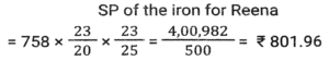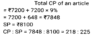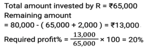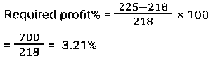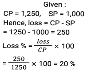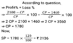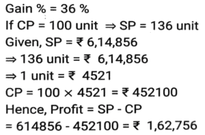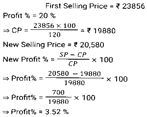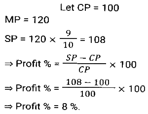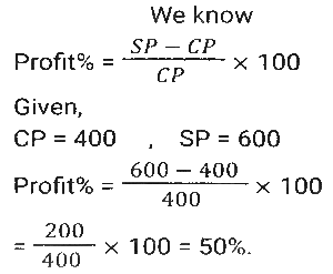 Profit and Loss (SSC) (Part-4)Total Questions: 5021. An iron costing ₹758 was sold by Ramesh at a gain of 15%, and it was again sold by Reena, who bought it from Ramesh, at a loss of 8%. Find the selling price of the iron for Reena (correct to two places of decimals). [Matriculation Level 20/06/2024 (Shift-1)](a) ₹810.96(b) ₹808.69(c) ₹820.69(d) ₹801.96Correct Answer: (d) ₹801.96Solution:22. If the cost price of a table is ₹400 and the selling price is ₹600, then find the profit percentage. [Matriculation Level 20/06/2024 (Shift-4)](a) 55%(b) 45%(c) 33%(d) 50%Correct Answer: (d) 50%Solution:23. A shopkeeper expects a gain of 36% on his cost price. If in a month, his sale was ₹6,14,856, then what was his profit (in ₹)? [Matriculation Level 20/06/2024 (Shift-4)](a) 1,61,235(b) 1,63,900(c) 1,62,756(d) 1,62,800Correct Answer: (c) 1,62,756Solution:24. A salesman purchases goods at 1,250 and is forced to sell it at ₹1,000. Find his loss percentage. [Matriculation Level 20/06/2024 (Shift-4)](a) 25%(b) 20%(c) 30%(d) 15%Correct Answer: (b) 20%Solution:25. A shopkeeper marks the price of his goods at 20% higher than the cost price and allows a discount of 10%. What is his profit percentage? [Matriculation Level 21/06/2024 (Shift-1)](a) 10%(b) 6%(c) 8%(d) 4%Correct Answer: (c) 8%Solution:26. The percentage profit earned by selling an article for Rs.2,100 is equal to the percentage loss incurred by selling the same article for Rs.1,460. At what price should the article be sold to make 20% profit? [Matriculation Level 21/06/2024 (Shift-1)](a) Rs.2,156(b) Rs.2,056(c) Rs.2,136(d) Rs.2,256Correct Answer: (c) Rs.2,136Solution:27. By selling a mobile phone for 23,856, Ramesh gains 20%. If he sells it for ₹20,580, find his gain or loss percentage (correct to two places of decimals). [Matriculation Level 21/06/2024 (Shift-1)](a) Loss 3.52%(b) Gain 5.32%(c) Gain 3.52%(d) Loss 5.32%Correct Answer: (c) Gain 3.52%Solution:28. The profit earned after selling a bucket for ₹680 is the same as the loss incurred after selling the bucket for ₹532. The cost price (in ₹) of the bucket is: [Matriculation Level 21/06/2024 (Shift-4)](a) 606(b) 612(c) 618(d) 610Correct Answer: (a) 606Solution:29. In a business, R invests ₹65,000 and he gets a total ₹80,000 back. Out of profit, ₹2,000 are spent as expenses of the business. What is his profit from the business in percentage? [Matriculation Level 21/06/2024 (Shift-4)](a) 18%(b) 25%(c) 22%(d) 20%Correct Answer: (d) 20%Solution:30. A shopkeeper purchased an article for ₹7,200 and spent 9% of its cost on repairs. He sold it to Rajan for ₹8,100. What was the profit percentage on selling the article? (Rounded off to 2 decimal places) [Matriculation Level 21/06/2024 (Shift-4)](a) 2.91%(b) 3.12%(c) 3.21%(d) 12.5%Correct Answer: (c) 3.21%Solution:Submit Quiz« Previous12345Next »
