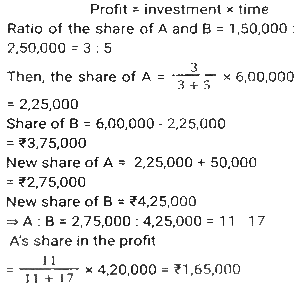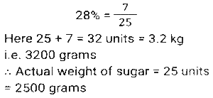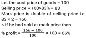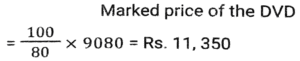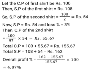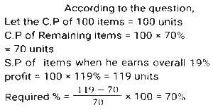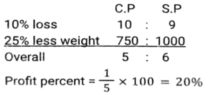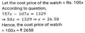Profit and Loss (SSC) (Part-5)Total Questions: 501. The cost of 4 chairs and 3 tables is 2,100 and the cost of 5 chairs and 2 tables is ₹1,750. Find the cost (in ₹) of a chair. [SSC CHSL Tier II 02/11/2023](a) 150(b) 130(c) 140(d) 125Correct Answer: (a) 150Solution:According to question, 4C + 3T = 2100 .........(i) 5C + 2T = 1750 .........(ii) From equation (ii) × 3 - (i) × 2, we get, 7C = 1050 ∴ C = 150 So price of a chair = 1502. A shopkeeper sold his goods at half the list price and thus lost 17%. If he had sold on the listed price, then his gain percentage would be: [SSC CHSL Tier II 02/11/2023](a) 17%(b) 41%(c) 83%(d) 66%Correct Answer: (d) 66%Solution:3. Sohan sells sugar at the cost price but uses false weights thus gaining 28% profit. How many grams of sugar is he giving for 3.2 kg sugar? [SSC CHSL Tier II 10/01/2024](a) 1500(b) 1900(c) 2200(d) 2500Correct Answer: (d) 2500Solution:4. Two friends A and B started a business by investing ₹1,50,000 and 2,50,000, respectively. They agreed to distribute their earnings in the same ratio of their investments. After an year, the profit earned was ₹6,00,000. Each of them added ₹50,000 to their respective profits and invested in a different project. If this project gave an yield of ₹4,20,000, then A's share in the profit is: [SSC CGL Tier II (26/10/2023)](a) ₹2,35,000(b) ₹1,65,000(c) ₹1,97,000(d) ₹1,84,000Correct Answer: (b) ₹1,65,000Solution:5. The first shirt is sold at twice the selling price of the second shirt. The first shirt is sold at 8% profit and the second shirt is sold at a 3% loss. What is the overall percentage profit on the shirts (Rounded off to two decimal places)? [SSC CPO 03/10/2023 (1st Shift)](a) 4.60%(b) 4.07%(c) 3.86%(d) 4.86%Correct Answer: (b) 4.07%Solution:6. Sukhvir purchased some perishable items for sale but 30% of those items could not be sold and went bad. However, Sukhvir managed to sell the rest of the items at a price that helped him earn an overall profit of 19%. At what percentage above the cost price of each item purchased by Sukhvir did he sell each of the items that did not go bad? [SSC CPO 03/10/2023 (2nd Shift)](a) 49%(b) 70%(c) 75%(d) 63%Correct Answer: (b) 70%Solution:7. If the difference between the selling prices of an article at profits of 10% and 7% is ₹6, then the cost price (in ₹) of the article is: [SSC CPO 03/10/2023 (2nd Shift)](a) 175(b) 150(c) 200(d) 100Correct Answer: (c) 200Solution:According to tyhe question, (10% - 7%) = ₹6 C.P (100%) = (6/3) × 100 = ₹2008. Mayur sold a watch at a profit of 7%. If he had sold it for ₹1,329 more, he would have gained 57%. Find the cost price (in ₹) of the watch. [SSC CPO 03/10/2023 (3rd Shift)](a) 2856(b) 2658(c) 2580(d) 2420Correct Answer: (b) 2658Solution:9. After deducing a commission of 20%, a DVD set costs ₹9,080. Its marked price is: [SSC CPO 04/10/2023 (1st Shift)](a) ₹11,350(b) ₹10,100(c) ₹10,000(d) ₹11,200Correct Answer: (a) ₹11,350Solution:10. A dealer sells his goods at 10% loss on the cost price but uses 25% less weight. What is his profit percentage ? [SSC CPO 04/10/2023 (1st Shift)](a) 20%(b) 35%(c) 25%(d) 15%Correct Answer: (a) 20%Solution:Submit Quiz12345Next »