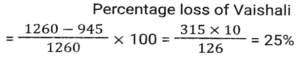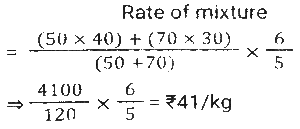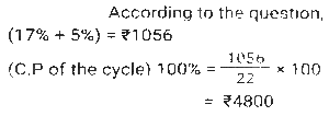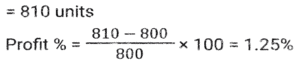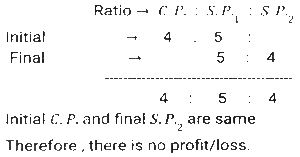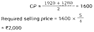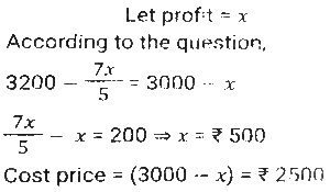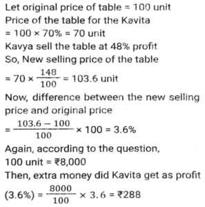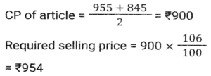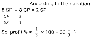Profit and Loss (SSC) (Part-5)Total Questions: 5021. A grocer purchased 50 kg of sugar at 40 per kg and mixed with 70 kg of sugar at ₹30 per kg. At what rate should he sell the mixture (per kg) to gain 20%? [SSC MTS 04/09/2023 (2nd Shift)](a) ₹60(b) ₹20(c) ₹35(d) ₹41Correct Answer: (d) ₹41Solution:22. A store sells an item for ₹500, making a profit of 25%. Later, the store reduces the price of the item by 20% to clear out old inventory. What is the new percentage profit or loss for the store? [SSC MTS 04/09/2023 (3rd Shift)](a) 2% profit(b) 5% profit(c) 5% loss(d) No profit, no lossCorrect Answer: (d) No profit, no lossSolution:23. Vaishali booked a bus ticket for 1,260. Because of her ill health, she had to cancel the ticket. She got a refund of ₹945 in this process. What is the percentage loss that Vaishali had to face? [SSC MTS 05/09/2023 (1st Shift)](a) 23%(b) 15%(c) 25%(d) 33%Correct Answer: (c) 25%Solution:24. By selling 8 items, a shopkeeper gains the selling price of 2 items. The gain percentage of the shopkeeper is: [SSC MTS 05/09/2023 (3rd Shift)](a) 25%(b) 16 ⅔ %(c) 33 ⅓ %(d) 30%Correct Answer: (c) 33 ⅓ %Solution:25. Zeenat earns 20% on an investment, but she loses 10% on other investments. If the two investments are respectively in the ratio of 3:5, then what is the percentage gain or loss for Zeenat on the two investments taken together? [SSC MTS 05/09/2023 (3rd Shift)](a) 1.25% Gain(b) 2.25% Loss(c) 1.25% Loss(d) 2.25% GainCorrect Answer: (a) 1.25% GainSolution:26. The profit obtained by a vendor 7 on selling goods at ₹3,200 is equal to (7/5)th of the profit obtained by selling the same goods at ₹3,000. What is the cost price (in ₹) of the goods? [SSC MTS 06/09/2023 (1st Shift)](a) 2,500(b) 2,700(c) 2,400(d) 2,900Correct Answer: (a) 2,500Solution:27. Kavita bought a table at 30% discount on its original price. She sold it with 48% increase on the price she bought it. What is the percentage difference between the new sale price and original price? If the original price is ₹8,000, then how much extra money did Kavita get as profit ? [SSC MTS 06/09/2023 (3rd Shift)](a) 5.6%; ₹280(b) 3.6%; ₹288(c) 6%; ₹360(d) 4.5%; ₹308Correct Answer: (b) 3.6%; ₹288Solution:28. A man sold his cycle at 17% loss. If he had sold it for ₹1,056 more, he would have made 5% profit. The cost price of the cycle is: [SSC MTS 08/09/2023 (2nd Shift)](a) ₹4,700(b) ₹3,800(c) ₹5,100(d) ₹4,800Correct Answer: (d) ₹4,800Solution:29. The percentage profit earned by selling an article for ₹955 is equal to the percentage loss incurred by selling the same article for ₹845. At what price should the article be sold to make a 6% profit? [SSC MTS 08/09/2023 (3rd Shift)](a) ₹955(b) ₹954(c) ₹925(d) ₹1,014Correct Answer: (b) ₹954Solution:30. Ravi sells a laptop bag to Reeta for ₹1,920 and he sells another similar laptop bag to Vinay for ₹1,280. The percentage profit earned in selling the laptop bag to Reeta is equal to the percentage loss in selling the laptop bag to Vinay At what price (in ₹) should Ravi sell the laptop bag to make a profit of 25%? [SSC MTS 08/09/2023 (3rd Shift)](a) 1,650(b) 1,600(c) 1,800(d) 2,000Correct Answer: (d) 2,000Solution:Submit Quiz« Previous12345Next »