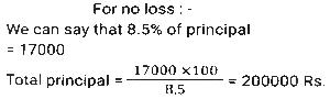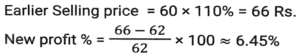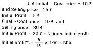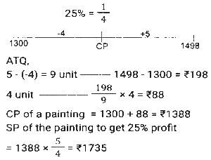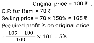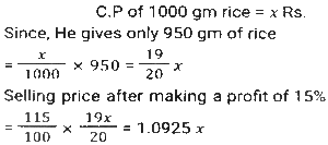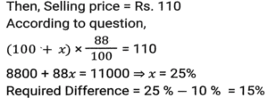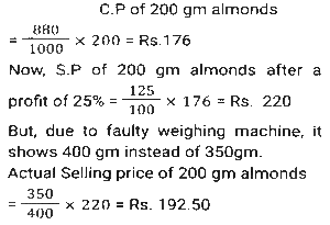 Profit and Loss (SSC) (Part-6)Total Questions: 5021. If the selling price of an article is doubled, then the profit becomes four times. What was the original profit percentage? [SSC CGL 17/07/2023 (4th shift)](a) 75%(b) 100%(c) 50%(d) 25%Correct Answer: (c) 50%Solution:22. R lends some money to S on which S pays ₹17,000 more to R. S lends the same money to T, on which T pays 8.5% more to S. What should be the minimum amount (in ₹) that S must borrow so that he does not incur any loss in the process? [SSC CGL 19/07/2023 (3rd shift)](a) 2,00,000(b) 2,25,000(c) 1,80,000(d) 1,70,000Correct Answer: (a) 2,00,000Solution:23. A seller professes to sell his fruits at cost price but still gains 5 ⁵⁄₁₉%. How much does he give for 1 kg? %. [SSC CGL 20/07/2023 (2nd shift)](a) 905 gm(b) 5 gm(c) 900 gm(d) 950 gmCorrect Answer: (d) 950 gmSolution:24. The cost price and selling price of rice are the same. Due to a faulty weighing machine, the seller earns a 15% profit. If Rs. x is the cost price of 1000 gm rice and the machine is changed which shows 1000 gm instead of 950 gm, what should be the selling price (in ₹) now to get the same percentage of profit? [SSC CGL 20/07/2023 (4th shift)](a) 1.0295x(b) 1.0259x(c) 1.0925x(d) 1.0950xCorrect Answer: (c) 1.0925xSolution:25. A dishonest shopkeeper sells millet at 20 per kg which he has bought at 16 per kg and he is giving 800 gm instead of 1000 gm. Find his actual profit percentage. [SSC CGL 24/07/2023 (2nd shift)](a) 52.12%(b) 58.36%(c) 54.25%(d) 56.25%Correct Answer: (d) 56.25%Solution:26. A person marks his goods x% above the cost price and allows a discount of 12% on the marked price. If his profit is 10%, then the difference between x% and the profit percentage is: [SSC CGL 24/07/2023 (4th shift)](a) 15%(b) 18%(c) 13%(d) 10%Correct Answer: (a) 15%Solution:27. R's weighing machine shows 400 gm when the actual weight is 350 gm. The cost price of almonds is ₹880 per kg and packets of 200 gm are made using the faulty machine. What should be the selling price (in ₹) of each packet to get a profit of 25%? [SSC CGL 26/07/2023 (1st shift)](a) 197.50(b) 175.50(c) 182.50(d) 192.50Correct Answer: (d) 192.50Solution:28. Ram bought a cell phone and paid 30% less than its original price. He sold it at 50% profit on the price he had paid. The percentage of profit earned by Ram on the original price was: [SSC CGL 26/07/2023 (4th shift)](a) 25%(b) 50%(c) 15%(d) 5%Correct Answer: (d) 5%Solution:29. On selling a painting at Rs.1,498, the gain is 25% more than the loss incurred on selling it at Rs.1,300. In order to gain 25%, the selling price will be: [SSC CGL 27/07/2023 (1st shift)](a) Rs.1,735(b) Rs.1,335(c) Rs.1,755(d) Rs.1,388Correct Answer: (a) Rs.1,735Solution:30. The cost price of milk has increased to ₹62 from ₹60. The milkman sold milk at 10% profit earlier. What is his profit% now if he sells milk at the same rate? [Graduate Level 27/06/2023 (Shift-4)](a) 5.46%(b) 6.54%(c) 6.45%(d) 5.64%Correct Answer: (c) 6.45%Solution:Submit Quiz« Previous12345Next »