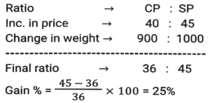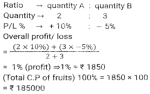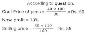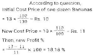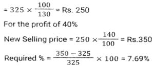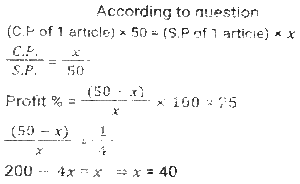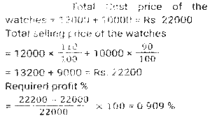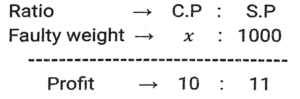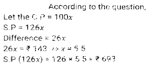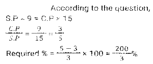 Profit and Loss (SSC) (Part-6)Total Questions: 5041. A dishonest shopkeeper sells sugar at a rate of Rs.45 per kg. The cost price of the sugar is Rs.40 per kg. Even after doing this, he tries to increase his profit by removing 100 gm from each packet of 1 kg. What is the gain percent of the shopkeeper ? [SSC MTS 08/05/2023 (Afternoon)](a) 30%(b) 35%(c) 20%(d) 25%Correct Answer: (d) 25%Solution:42. A dishonest shopkeeper pretends to sell his goods at cost price but uses false weights and gain 10%. How much false weight he is using instead 1 kg weight? [SSC MTS 09/05/2023 (Afternoon)](a) 909.09 gm(b) 900 gm(c) 920.30 gm(d) 911.12 gmCorrect Answer: (a) 909.09 gmSolution:43. If the selling price of 9 boxes is equal to the cost price of 15 boxes. The gain percent is (Selling price of all boxes is same. Cost price of all boxes is same): [SSC MTS 11/05/2023 (Evening)](a) (50/3)%(b) (200/3)%(c) (100/3)%(d) (140/3)%Correct Answer: (b) (200/3)%Solution:44. Vijay sells bananas at the rate of Rs. 13 per dozen and earns a profit of 30 percent. The cost price of the bananas increases by 10 percent. If the selling price remains the same, then what is his new profit percent? [SSC MTS 12/05/2023 (Afternoon)](a) 16.66%(b) 18.18%(c) 14.28%(d) 12.5%Correct Answer: (b) 18.18%Solution:45. The difference between cost price and selling price is Rs. 143. If profit percentage is 26 percent, then what is the selling price? [SSC MTS 15/05/2023 (Morning)](a) Rs. 603(b) Rs. 676(c) Rs. 693(d) Rs. 713Correct Answer: (c) Rs. 693Solution:46. The cost price of 50 articles is same as the selling price of x articles. If there is a profit of 25 percent, then what is the value of x? (Selling price of all articles is same. Cost price of all articles is same) [SSC MTS 16/05/2023 (Morning)](a) 20(b) 40(c) 30(d) 25Correct Answer: (b) 40Solution:47. A person loses 20 percent on selling 80 pens for Rs. 40. What should be the selling price of 80 pens to earn a profit of 10 percent? [SSC MTS 17/05/2023 (Morning)](a) Rs.80(b) Rs.60(c) Rs.55(d) Rs.65Correct Answer: (c) Rs.55Solution:48. Shivam purchased two watches, first for Rs. 12000 and the second for Rs. 10000. He sold both the watches, first one at the profit of 10 percent and the second at a loss of 10 percent. What is the overall profit or loss? [SSC MTS 19/05/2023 (Morning)](a) 2.25 percent profit(b) 2.25 percent loss(c) 0.909 percent profit(d) 0.909 percent lossCorrect Answer: (c) 0.909 percent profitSolution:49. A fruit seller sells (2/5)th th part of fruits at a profit of 10% and remaining at a loss of 5%. If the total profit is Rs. 1850, then what is the total cost price of fruits? [SSC MTS 19/05/2023 (Afternoon)](a) Rs.198000(b) Rs.205000(c) Rs.185000(d) Rs.176000Correct Answer: (c) Rs.185000Solution:50. A person earns a profit of 30 percent by selling an article for Rs. 325. How much percent should he increase his selling price to earn a profit of 40 percent? [SSC MTS 19/05/2023 (Evening)](a) 6.66%(b) 8.25%(c) 7.69%(d) 5.25%Correct Answer: (c) 7.69%Solution:Submit Quiz« Previous12345
