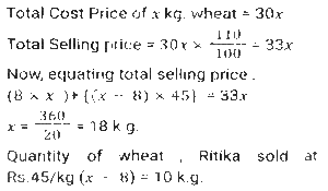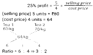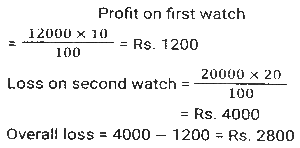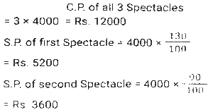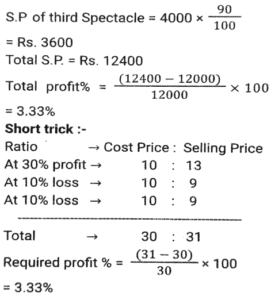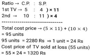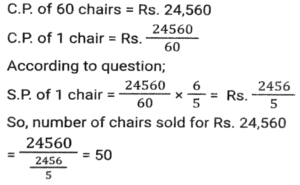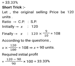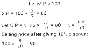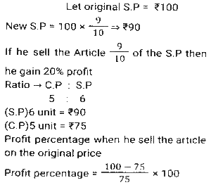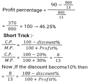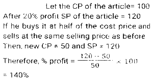 Profit and Loss (SSC) (Part-7)Total Questions: 5011. A trader sells an article at 20 percent profit. If he buys it at half of the cost price and sells at the same selling price as before, then what will be the profit percentage? [SSC CHSL 13/03/2023 (3rd Shift)](a) 240%(b) 40%(c) 140%(d) 60%Correct Answer: (c) 140%Solution:12. Ritika purchased š kg wheat at Rs.30/kg and sold 8 kg of this at Rs. 'x' per kg and remaining at Rs.45/kg. Overall profit percent earned is 10%, then what quantity of wheat Ritika sold at Rs.45/kg? [SSC CHSL 14/03/2023 (2nd Shift)](a) 18 kg(b) 16 kg(c) 10 kg(d) 14 kgCorrect Answer: (c) 10 kgSolution:13. A shopkeeper sells a table at a discount of 20 percent and earns a profit of 30 percent. If he sells the same table at 10 percent discount. then what will be his new profit or loss percent? [SSC CHSL 14/03/2023 (3rd Shift)](a) 32.5 percent profit(b) 40.5 percent loss(c) 46.25 percent profit(d) 50.5 percent lossCorrect Answer: (c) 46.25 percent profitSolution:14. If an article is sold at (9/10) th of its usual selling price. 20% profit would be made on it. Find the profit percentage which would have been made on it on selling it at its usual selling price. [SSC CHSL 15/03/2023 (1st Shift)](a) 33.33%(b) 25%(c) 30%(d) 20%Correct Answer: (a) 33.33%Solution:15. If 60 chairs are bought for Rs.24,560, then how many chairs must be sold for Rs.24,560 to earn a profit of 20 percent? [SSC CHSL 15/03/2023 (3rd Shift)](a) 50(b) 40(c) 30(d) 60Correct Answer: (a) 50Solution:16. Manoj bought two T.V. for Rs.2,280. He sold one at a loss of 20 percent and other at a profit of 10 percent. If each T.V was sold for the same price, then what is the cost price of the TV which was sold at loss? [SSC CHSL 16/03/2023 (1st Shift)](a) Rs.1,380(b) Rs.1,320(c) Rs.1,050(d) Rs.1,440Correct Answer: (b) Rs.1,320Solution:17. A person buys three spectacles at the rate of Rs.4,000 per spectacles. He sells first spectacles at a profit of 30 percent, sells second spectacles at a loss of 10 percent and sells third spectacles at a loss of 10 percent. What is the total percentage of profit earned in the whole transaction? [SSC CHSL 16/03/2023 (4th Shift)](a) 7.14 percent(b) 2.18 percent(c) 3.33 percent(d) 5.41 percentCorrect Answer: (c) 3.33 percentSolution:18. On selling a table for Rs. 210 and Rs. 420 there will be loss of Lā% and Lā % respectively. If Lā - Lā = 7, then what is the cost price of table? [SSC CHSL 17/03/2023 (2nd Shift)](a) Rs. 5,000(b) Rs. 3,000(c) Rs. 7,000(d) Rs. 4,000Correct Answer: (b) Rs. 3,000Solution:19. In what ratio tea of Rs.60 per kg should be mixed with tea of Rs.70 per kg so that on selling the mixture at Rs.80 per kg there is a profit of 25 percent? [SSC CHSL 20/03/2023 (2nd Shift)](a) 3 : 2(b) 2 : 3(c) 5 : 2(d) 4 : 1Correct Answer: (a) 3 : 2Solution:20. Shivam purchased two watches, first for Rs. 12000 and the second for Rs. 20,000. He sold both the watches, first one at the profit of 10 percent and the second at a loss of 20 percent. What is the overall profit or loss? [SSC CHSL 20/03/2023 (3rd Shift)](a) Profit = Rs. 2600(b) Loss = Rs. 2800(c) Loss = Rs. 2400(d) Profit = Rs. 2200Correct Answer: (b) Loss = Rs. 2800Solution:Submit Quiz« Previous12345Next »