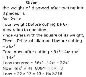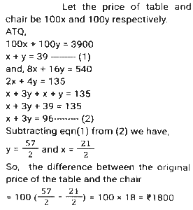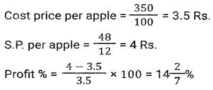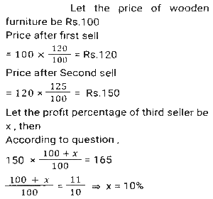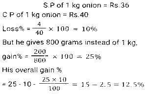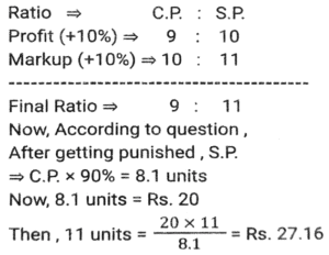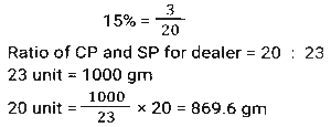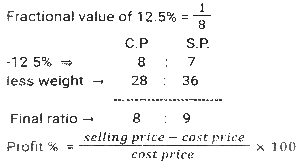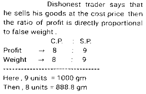 Profit and Loss (SSC) (Part-7)Total Questions: 5021. A faulty weighing machine reads 1 kg when 900 gm is actually weighted on it. The shopkeeper marked the price of his goods by 10%, but unfortunately he was caught by the metrology department and then they ordered him to repair his weighing machine and gave punishment to sell the goods at a 10% discount on cost price for a month. If each customer is now paying 20 for 1 kg, then before the raid_______amount they have paid for the same quantity. (Rounded off to two places of decimal) [SSC CHSL 21/03/2023 (3rd Shift)](a) ₹27.16(b) ₹27.04(c) ₹28.05(d) ₹28.15Correct Answer: (a) ₹27.16Solution:22. A dishonest merchant sells goods at a 12.5% loss on the cost price, but uses 28 g weight instead of 36 g. What is his percentage profit or loss? [SSC CGL 01/12/2022 (1st Shift)](a) 6.25% loss(b) 12.5% gain(c) 18.75% gain(d) 10.5% lossCorrect Answer: (b) 12.5% gainSolution:23. The price of some wooden furniture increases by 65% when it passes through three hands. If the first and second sellers made a profit of 20% and 25%, respectively, then find the profit percentage of the third seller. [SSC CGL 02/12/2022 (3rd Shift)](a) 10%(b) 12.5%(c) 16%(d) 8%Correct Answer: (a) 10%Solution:24. The cost of a piece of diamond varies with the square of its weight. A diamond of Rs.6,084 value is cut into 3 pieces whose weights are in the ratio 3:2:1. Find the loss involved in the cutting. [SSC CGL 03/12/2022 (2nd Shift)](a) Rs.3,768(b) Rs.3,718(c) Rs.3,168(d) Rs.3,518Correct Answer: (b) Rs.3,718Solution:25. A dishonest trader says to customers that he sells his goods at a cost price, but he uses a false weight and gains 12.5% as profit. How many grams does he use to weigh 1 kg? [SSC CGL 03/12/2022 (4th Shift)](a) 900 g(b) 880.5 g(c) 850 g(d) 888.8 gCorrect Answer: (d) 888.8 gSolution:26. Apples were purchased at 100 for Rs.350 and sold at Rs.48 a dozen. What is the profit or loss percentage? [SSC CGL 05/12/2022 (4th Shift)](a) Profit 14 ²⁄₇ %(b) Loss 18 ⅗ %(c) Loss 10%(d) Profit 12%Correct Answer: (a) Profit 14 ²⁄₇ %Solution:27. Ramesh claims that he is selling onions at Rs.36 per kg, which costs him Rs.40 per kg, but he gives 800 grams instead of 1 kg. Find Ramesh's percentage gain or loss. [SSC CGL 07/12/2022 (4th Shift)](a) Gain 13.5%(b) Loss 13.5%(c) Loss 12.5%(d) Gain 12.5%Correct Answer: (d) Gain 12.5%Solution:28. A shopkeeper advertises for selling clothes at a 7% loss. However, by using a false scale of length 1 metre he actually gains 24%. What will be the actual length he uses instead of 1 metre? [SSC CGL 08/12/2022 (1st Shift)](a) 75cm(b) 31cm(c) 76cm(d) 93cmCorrect Answer: (a) 75cmSolution:Let the gains y% by selling a false scale and the length he uses be x cm. 29. A dishonest dealer professes to sell his goods at cost price but uses a false weight and thus gains 15%. For a kilogram, he uses a weight of _________ .(rounded off to one digit after decimal). [SSC CGL 12/12/2022 (2nd Shift)](a) 833.3 gm(b) 876.7 gm(c) 869.6 gm(d) 898.33 gmCorrect Answer: (c) 869.6 gmSolution:30. Ramesh purchases a table and a chair for Rs.3,900. He sells the table at a profit of 8% and the chair at a profit of 16%. He earns a profit of Rs.540. What is the difference between the original price of the table and the chair? [SSC CGL 13/12/2022 (1st Shift)](a) Rs.2,000(b) Rs.1,800(c) Rs.1,900(d) Rs.1,700Correct Answer: (b) Rs.1,800Solution:Submit Quiz« Previous12345Next »