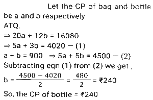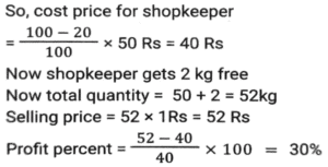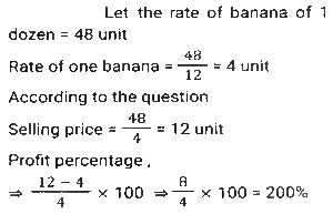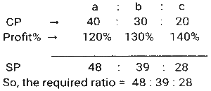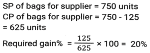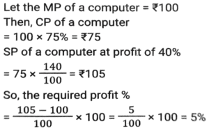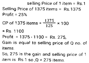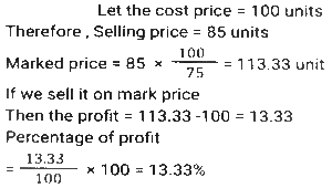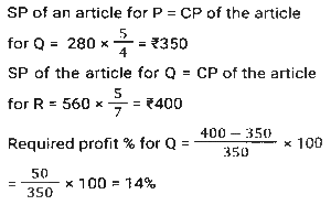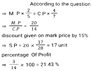 Profit and Loss (SSC) (Part-7)Total Questions: 5041. P buys an article for Rs.280 and sells it to Q at a profit of 25%. Q sells it to R at some profit. R sells it to S for Rs.560 making a profit of 40%. What percentage profit (rounded off to the nearest integer) did Q make? [Graduate Level 05/08/2022 (Shift-3)](a) 26%(b) 14%(c) 32%(d) 20%Correct Answer: (b) 14%Solution:42. A multi-store outlet sold 1375 items in a week earning 25% gain. The gain is also equal to the selling price of 'Q' number of items. What is the value of Q? [Higher Secondary 02/08/2022 (Shift-2)](a) 250(b) 325(c) 225(d) 275Correct Answer: (d) 275Solution:43. A shopkeeper purchases supplies from a supplier. The supplier sells 750 units of bags to the shopkeeper after gaining the sale price of 125 units of bags. What is the gain percentage of the supplier? [Higher Secondary 04/08/2022 (Shift-3)](a) 16%(b) 20%(c) 22%(d) 15%Correct Answer: (b) 20%Solution:44. A shopkeeper buys three products a, b, c and sells them at 20%, 30%, 40% profit, respectively. What is the ratio of the selling price of these products, if the ratio of their cost prices is 4:3:2? [SSC MTS 05/07/2022 (Morning)](a) 34:54:12(b) 48:39:28(c) 56:26:21(d) 24:39:14Correct Answer: (b) 48:39:28Solution:45. Ranveer bought a computer paying 25% less than the list price and sold it to his neighbour at a 40% profit on his purchase cost. The profit percentage earned by Rnaveer on the list price of the computer is: [SSC MTS 05/07/2022 (Evening)](a) 10%(b) 7.5%(c) 6.67%(d) 5%Correct Answer: (d) 5%Solution:46. A bought a bag and a bottle for a total of ₹900. He sold the bottle at a profit of 12% and the bag at a profit of 20%. If he earned a total profit of ₹160.80, then calculate the cost price of the bottle. [SSC MTS 07/07/2022 (Morning)](a) ₹320(b) ₹300(c) ₹200(d) ₹240Correct Answer: (d) ₹240Solution:47. If 25% discount is given on an article, then there will be a loss of 15%. if the article is sold at its marked price, Then what will the profit percentage be? [Give your answer correct to 2 decimal places] [SSC MTS 11/07/2022 (Morning)](a) 15.66%(b) 12.66%(c) 13.33%(d) 10.22%Correct Answer: (c) 13.33%Solution:48. A person buys some bananas at ₹Y per dozen and sells them at ₹(Y/4) per banana. What is his gain percentage? [SSC MTS 11/07/2022 (Evening)](a) 200%(b) 50%(c) 80%(d) 100%Correct Answer: (a) 200%Solution:49. 2/5 of the marked price of an item is equal to 4/7 of its cost price. If a discount of 15% is given on its sale, then what is the approximate profit percentage earned ? [SSC MTS 11/07/2022 (Evening)](a) 19.84%(b) 23.63%(c) 21.43%(d) 14.28%Correct Answer: (c) 21.43%Solution:50. A retailer bought 50 kg of Arhar Dal at a discount of 20%. Another 2 kg of Arhar dal was offered to him for free by the wholesaler on the purchase of 50 kg of the dal. If the retailer sells the entire quantity of the dal at the marked price to a customer, what is the profit percentage gained by the retailer? [SSC MTS 13/07/2022 (Morning)](a) 30%(b) 22%(c) 12%(d) 15%Correct Answer: (a) 30%Solution:Let price of arhar dal = 1 Rs/kg According to the questions shopkeeper purchsed 50 kg at 20% discount Submit Quiz« Previous12345