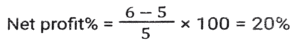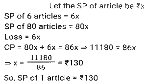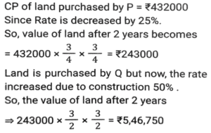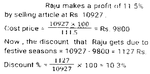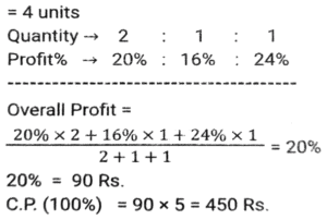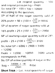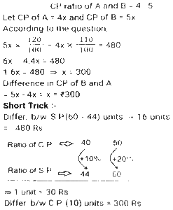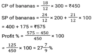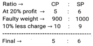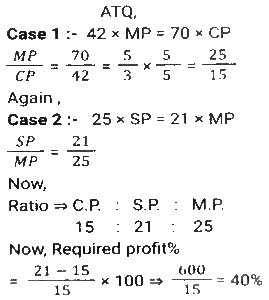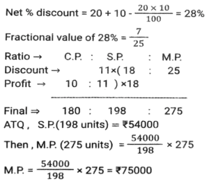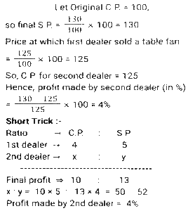 Profit and Loss (SSC) (Part-8)Total Questions: 3811. A man P purchased a land for ₹4,32,000 on the outskirts of a city. Due to some reason, its value depreciated at 25% per annum and he sold it to Q after 2 years. At this time, the city expanded and new projects of infrastructures started coming up. As a result of the expansion, there was an appreciation of real estate prices at the rate of 50%. What would be the value (in ₹) of the land after 2 years, from the time Q bought the land from P? [SSC CHSL 24/05/2022 (Afternoon)](a) ₹5,46,750(b) ₹5,57,450(c) ₹5,76,450(d) ₹6,05,070Correct Answer: (a) ₹5,46,750Solution:12. Kamal purchases 80 articles for 11,180 and sells them at a loss equal to the selling price of 6 articles. What will be the selling price of 1 article? [SSC CHSL 25/05/2022 (Morning)](a) ₹130(b) ₹120(c) ₹135(d) ₹125Correct Answer: (a) ₹130Solution:13. A shopkeeper normally makes a profit of 20% in a certain transaction; he weighs 900 g instead of 1 kg, due to an issue with the weighing machine. If he charges 10% less than what he normally charges, what is his actual profit or loss percentage? [SSC CHSL 27/05/2022 (Morning)](a) 20%(b) 28%(c) 25%(d) 30%Correct Answer: (a) 20%Solution:14. A fruit seller purchased 300 bananas at the rate of ₹18 per dozen and sold 200 bananas at the rate of ₹24 per dozen and the remaining bananas at the rate of ₹21 per dozen. What is his net profit percentage? [SSC CHSL 31/05/2022 (Evening)](a) 28%(b) 26%(c) 27%(d) 27 ⁷⁄₉ %Correct Answer: (d) 27 ⁷⁄₉ %Solution:15. The marked price of 42 items was equal to the cost price of 70 items. The selling price of 25 items was equal to the marked price of 21 items. Calculate the percentage profit or loss from the sale of each item. [SSC CHSL 01/06/2022 (Afternoon)](a) 42% profit(b) 29% profit(c) 29% loss(d) 40% profitCorrect Answer: (d) 40% profitSolution:16. A merchant gives an additional discount of 10% on the product after an initial discount of 20% on the listed price. He managed to make a 10% profit by selling the product for ₹54,000. What was the listed price of the product? [SSC CHSL 06/06/2022 (Evening)](a) ₹77,500(b) ₹77,000(c) ₹75,000(d) ₹72,500Correct Answer: (c) ₹75,000Solution:17. If half of the quantity of sugar in a bag was sold at a profit of 20%, a quarter of the quantity of sugar in the bag was sold at a profit of 16% and the remaining sugar in the bag was sold at a profit of 24%, and the total profit obtained by selling all the sugar in the bag was ₹90, what was the cost price of the entire quantity of sugar in the bag? [SSC CHSL 08/06/2022 (Evening)](a) ₹450(b) ₹750(c) ₹500(d) ₹400Correct Answer: (a) ₹450Solution:18. A table fan, passing through two hands, is finally sold at a profit of 30% of the original cost price. If the first dealer makes a profit of 25%, then the profit made by the second dealer is: [SSC CHSL 09/06/2022 (Evening)](a) 5%(b) 10%(c) 15%(d) 4%Correct Answer: (d) 4%Solution:19. The marked price of an article is 10,927. Due to the festive season, a certain percentage of discount is declared. Raju buys an article at a reduced price and sells it at ₹10,927, and makes a profit of 11.5%. What was the percentage discount offered? [SSC CGL 11/04/2022 (Morning)](a) 10.3%(b) 11.3%(c) 11.5%(d) 10.9%Correct Answer: (a) 10.3%Solution:20. The cost price of two articles A and B are in the ratio 4 : 5. While selling these articles the shopkeepers gains 10% on article A and 20% on article B and the difference in their selling price is 480. The difference in the cost price (in ₹) of article B and A is; [SSC CGL 12/04/2022 (Afternoon)](a) 250(b) 300(c) 400(d) 350Correct Answer: (b) 300Solution:Submit Quiz« Previous1234Next »