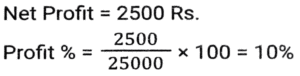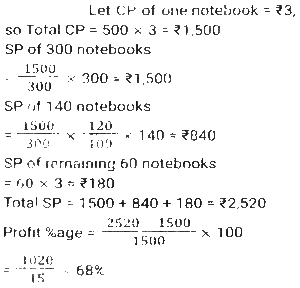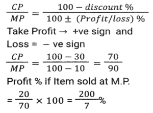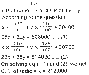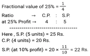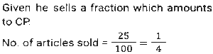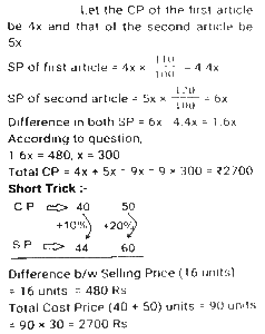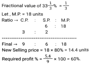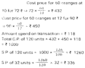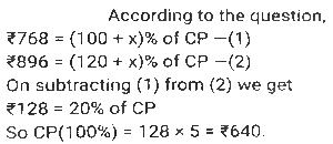 Profit and Loss (SSC) (Part-8)Total Questions: 3821. Manjeet bought a second hand motorbike for ₹22,000 and spent ₹23,000 on its overhauling and maintenance. He then sold it with 12% profit. If he had sold it for ₹500 less, then what would have been his profit percentage ? [SSC CGL 20/04/2022 (Morning)](a) 10.5%(b) 10%(c) 5%(d) 8%Correct Answer: (b) 10%Solution:22. An article is sold at a certain price. If it is sold at 70% of this price, then there is a loss of 10%. What is the percentage profit, when it is sold at the original selling price? [SSC CGL 20/04/2022 (Evening)](a) (50/7) %(b) (200/7) %(c) (300/7) %(d) (100/7) %Correct Answer: (b) (200/7) %Solution:23. A vegetable vendor sold 1 kg of potatoes for Rs. 25 and earned 25% profit. In the evening, he started selling potatoes with only 10% profit. At what cost (in ₹) per kg did he sell the potatoes in the evening? [SSC CGL 21/04/2022 (Evening)](a) 21(b) 20(c) 24(d) 22Correct Answer: (d) 22Solution:24. An article is sold at a certain price. If it is sold at 33⅓ % of this price, there is a loss of 33⅓ %. What is the percentage profit if the article is sold at 80% of its original selling price? [SSC CGL Tier II (29/01/2022)](a) 70%(b) 60%(c) 40%(d) 50%Correct Answer: (b) 60%Solution:25. The cost prices of two articles are in the ratio 4 : 5. While selling these articles, the shopkeeper gains 10% on one article and 20% profit on the other article, and the difference in the selling price is ₹480. Find the total cost price of both the articles. [SSC MTS 06/10/2021 (Morning)](a) ₹3,000(b) ₹2,700(c) ₹2,500(d) ₹2,800Correct Answer: (b) ₹2,700Solution:26. When an article is sold for ₹768, the profit percentage is x%. When the same article is sold for ₹896, the profit percentage is (x + 20)%. What is the value of x? [SSC MTS 06/10/2021 (Evening)](a) 30(b) 25(c) 15(d) 20Correct Answer: (d) 20Solution: 27. A man sold a radio and a TV set together for ₹30,400, thereby making a profit of 25% on the radio and 10% on the TV set. By selling them together for ₹30,700, he would have made a 10% profit on the radio and 25% on the TV set. The cost price of the radio is: [SSC MTS 12/10/2021 (Evening)](a) ₹10,000(b) ₹12,000(c) ₹8,000(d) ₹9,000Correct Answer: (b) ₹12,000Solution:28. A shopkeeper bought 500 notebooks. He sold 300 of them for the price he paid for all 500 notebooks. He sold 140 notebooks at a 20% higher rate than that at which he sold 300 notebooks and the remaining at the cost price. What is the profit percentage in the whole transaction? [SSC MTS 14/10/2021 (Afternoon)](a) 60%(b) 56%(c) 68%(d) 64%Correct Answer: (c) 68%Solution:29. A trader purchased 500 kg of sugar at ₹40 per kg. He sold 200 kg of it at a profit of 10% and 120 kg at a loss of 5%. At what rate per kg (in ₹, correct to 2 decimal places) should he sell the remaining sugar to gain 12% on his initial investment? [SSC MTS 18/10/2021 (Afternoon)](a) 48.67(b) 52.33(c) 50.22(d) 44.80Correct Answer: (c) 50.22Solution:30. A shopkeeper buys 60 oranges at 10 for ₹72, and an equal number at 12 for ₹90. He spends ₹118 on the transaction and sells all the oranges that he buys. If there is a profit of 26% in the entire transaction, then what is the selling price of 32 oranges? [SSC MTS 27/10/2021 (Afternoon)](a) ₹336(b) ₹313.60(c) ₹316.80(d) ₹320Correct Answer: (a) ₹336Solution:Submit Quiz« Previous1234Next »