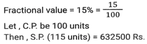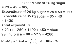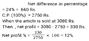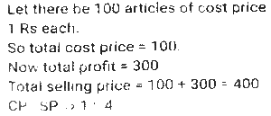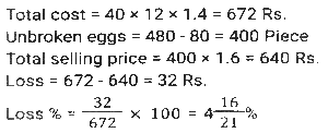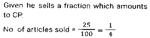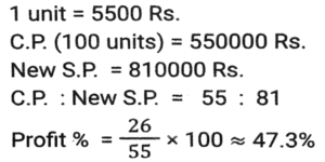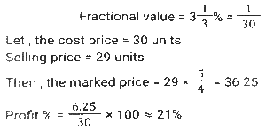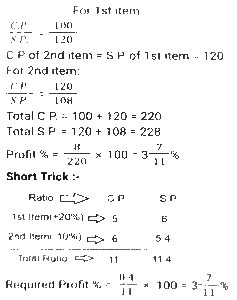 Profit and Loss (SSC) (Part-8)Total Questions: 3831. If a shopkeeper purchases a certain number of items for a certain sum and sells a fraction of the said number for the same amount, then his profit is 300%. What is the fraction? [SSC MTS 02/11/2021 (Evening)](a) 1/4(b) 1/3(c) 1/6(d) 1/2Correct Answer: (a) 1/4Solution:32. A shopkeeper bought 20 kg of sugar at Rs.45 per kg, 25 kg of sugar at Rs.50 per kg and 35 kg of sugar at Rs.40 per kg. He spent a sum of Rs.450 on transportation and other expenses. He mixed all the three types of sugar and sold all the stock at Rs.52.50 per kg. His profit percent in the entire transaction is: [SSC CGL 17/08/2021 (Afternoon)](a) 5%(b) 7.25%(c) 4.25%(d) 6.5%Correct Answer: (a) 5%Solution:33. A shopkeeper sold two items. The selling price of the first item equals the cost price of the second item. He sold the first item at a profit of 20%, and the second item at a loss of 10%. What is the overall profit/loss percent? [SSC CGL 20/08/2021 (Afternoon)](a) Loss, 4 ⁶⁄₁₁ %(b) Profit, 3 ⁷⁄₁₁ %(c) Profit, 4 ⁷⁄₁₁ %(d) Loss, 8 ⅓ %Correct Answer: (b) Profit, 3 ⁷⁄₁₁ %Solution:34. A shopkeeper sold an article at four-fifth of the marked price and suffered a loss of 3 ⅓ %. Find the profit percent, if he sold the article at the marked price. (correct to nearest integer) [SSC CGL 24/08/2021 (Afternoon)](a) 20(b) 22(c) 18(d) 21Correct Answer: (d) 21Solution:35. A shopkeeper bought 40 dozen eggs at Rs.1.40 each. 80 eggs were broken in transportation. He sold the remaining eggs at Rs.1.60 each. What is his profit or loss per cent? [SSC CHSL 13/04/2021 (Afternoon)](a) Loss, 3 ¹⁹⁄₂₇(b) Profit, 3 ¹⁹⁄₂₇(c) Profit, 4 ¹⁶⁄₂₁(d) Loss, 4 ¹⁶⁄₂₁Correct Answer: (d) Loss, 4 ¹⁶⁄₂₁Solution:36. A man buys goods for Rs.8000. He sells 30% of those goods at a profit of 12% and 40% of the remaining goods at a profit of 25%. At what profit percentage should he sell the remaining goods to gain 30% in the entire transaction. (correct to one decimal place)? [SSC CHSL 19/04/2021 (Morning)](a) 42.6%(b) 46.2%(c) 48.4%(d) 31.6%Correct Answer: (b) 46.2%Solution:Let, total quantity be 100 units. According to question, 30 × 12% + 28 × 25% + 42 × x% = 100 × 30% 42x + 1060 = 3000 x = 46.19% ≈ 46.2%37. By selling a car for Rs.6,32,500, a showroom owner makes a profit of 15%. If he sold the car at Rs. 8,10,000, then what would be the profit percentage (correct to one decimal place) [SSC CHSL 10/08/2021 (Evening)](a) 47.3%(b) 44.8%(c) 41.5%(d) 51.4%Correct Answer: (a) 47.3%Solution:38. A person sold an article at a loss of 16%. Had he sold it for Rs.660 more, he would have gained 8%. If the article is sold at Rs. 3,080, then how much profit percentage is gained? [SSC CPO 25/11/2020 (Morning)](a) 10%(b) 15%(c) 20%(d) 12%Correct Answer: (d) 12%Solution:Submit Quiz« Previous1234