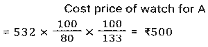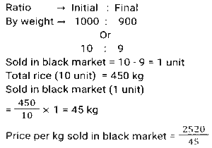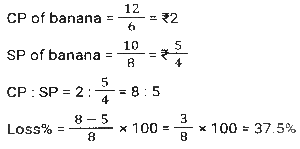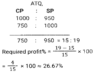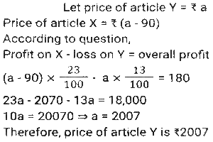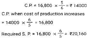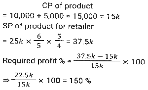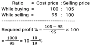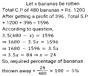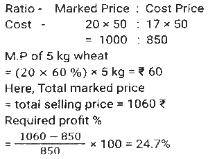 Profit and Loss (SSC)Total Questions: 5011. A shopkeeper claims to sell 450 kg rice at a cost price of ₹40 per kg but uses a weight of 900 grams instead of a one kilogram weight. He makes a profit of 2,520 by selling the remaining rice in the black market. The ratio of the black-market price to the original price per kg of rice is: [Higher Secondary 25/06/2024 (Shift-2)](a) 7 : 5(b) 10 : 7(c) 9 : 4(d) 4 : 3Correct Answer: (a) 7 : 5Solution:12. A person bought bananas at 6 for 12 and sold them at 8 for ₹10. Find his gain or loss percentage? [Matriculation Level 25/06/2024 (Shift-1)](a) 3.75% gain(b) 37.5% loss(c) 375% gain(d) 0.375% lossCorrect Answer: (b) 37.5% lossSolution:13. A sells a watch to B at a profit of 33% and B sells it to C at a loss of 20%. If C pays ₹532, then what was the cost price for A? [SSC CHSL Tier II 10/01/2024](a) ₹500(b) ₹800(c) ₹400(d) ₹600Correct Answer: (a) ₹500Solution:14. B purchased 15 kg apples at the rate of 180 per kg from a wholesaler who uses a weight of 950 grams for the kg weight. B sold all these apples at ₹180 per kg but used a weight of 750 grams for the kg weight. Find the percentage profit earned by B in the transaction (correct to 2 places of decimal). [SSC CGL Tier II (26/10/2023)](a) 22.55%(b) 25.75%(c) 33.33%(d) 26.67%Correct Answer: (d) 26.67%Solution:15. Aditya sold article X at a profit of 23% and article Y at a loss of 13%. He earned a profit of ₹180 in the entire transaction. If article X costs ₹90 less than article Y, then what is the price of article Y (in ₹)? [SSC CPO 03/10/2023 (3rd Shift)](a) 2,007(b) 2,050(c) 2,100(d) 2,020Correct Answer: (a) 2,007Solution:16. A company buys raw materials for 10,000 and manufactures a product that costs an additional ₹5,000 in labour and overhead. The product is sold to a distributor for ₹25,000, who marks it up by 20% and sells it to a retailer. The retailer then marks it up by another 25% and sells it to the end customer. What is the overall percentage profit made by the company, distributor, and retailer combined? [SSC MTS 11/09/2023 (3rd Shift)](a) 100%(b) 150%(c) 125%(d) 135%Correct Answer: (b) 150%Solution:17. By selling a TV set for ₹16,800, a salesman gains a profit of 20%. If the production cost is increased by 20%, find the new selling price of the set so as to gain 20%. [SSC MTS 04/09/2023 (1st Shift)](a) ₹18,160(b) ₹18,480(c) ₹20,160(d) ₹20,480Correct Answer: (c) ₹20,160Solution:18. Arun brought 50 kg of rice at a discount of 15% on the marked price. For purchasing bulk quantity, he was given 5 kg of wheat (the marked price of which was 60% the marked price of rice) free of cost. Had the retailer sold both items at their marked price to his other customers, then approximately what would be the profit percentage that the shopkeeper could earn? [SSC CHSL 14/08/2023 (1st Shift)](a) 24.7%(b) 25.2%(c) 22.8%(d) 23.5%Correct Answer: (a) 24.7%Solution:19. A fruit seller buys 480 bananas for 1,200. Some of these bananas are rotten and hence, they are thrown away. He sells the remaining bananas at ₹3.5 each and makes a profit of ₹396. What is the percentage of bananas thrown away? [SSC CHSL 11/08/2023 (4th Shift)](a) 6%(b) 4.5%(c) 5%(d) 4%Correct Answer: (c) 5%Solution:20. A tailor buys lining clothes from a wholesale merchant and cheats him by using a measurement tape which is 5 cm longer than the normal tape. The tailor offers the customers at cost price while stitching different garments and uses measurements tape which is 5 cm shorter than the normal tape. The gain percent is: [SSC CHSL 03/08/2023 (3rd Shift)](a) 15%(b) 10¹⁰⁄₂₅ %(c) 10%(d) 10¹⁰⁄₁₉ %Correct Answer: (d) 10¹⁰⁄₁₉ %Solution:Submit Quiz« Previous12345Next »