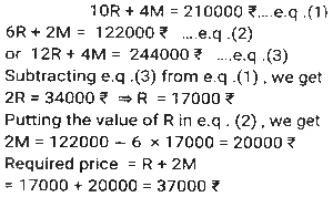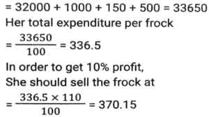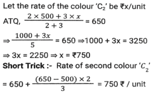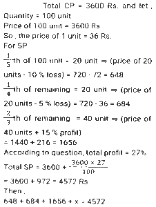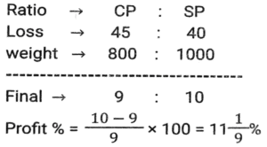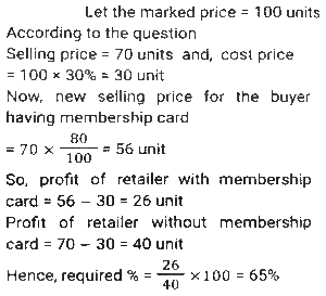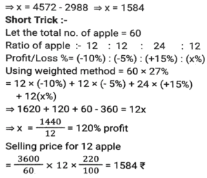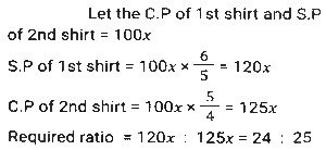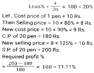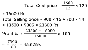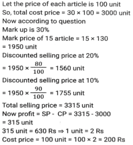 Profit and Loss (SSC)Total Questions: 5021. Rini has mixed two colours 'C₁' and 'C₂' in the ratio 2: 3. If the rate of the colour 'C₁' is ₹500 per unit and she is selling the mixture of the two colours at 650 per unit at breakeven price, then what is the rate (in ₹) per unit of the second colour, that is, 'C₂' ? [SSC CGL 27/07/2023 (1st shift)](a) 750(b) 725(c) 760(d) 765Correct Answer: (a) 750Solution:22. A shopkeeper purchased 1600 mangos at the rate of ₹120 per dozen. Out of these, he sold 900 mangoes at 15 per mango and the remaining mangoes at ₹14 per mango. His gain percentage is: [SSC CGL 25/07/2023 (4th shift)](a) 45.625%(b) 38.265%(c) 35.625%(d) 48.765%Correct Answer: (a) 45.625%Solution:23. A shopkeeper bought a certain number of apples for Rs.3,600. He sold one fifth of them at a loss of 10%, one-fourth of the remaining apples at a loss of 5%, and two-third of the rest at a profit of 15%. At what price (in Rs.) should he sell the remaining apples to earn a profit of 27% overall? [SSC CGL 25/07/2023 (1st shift)](a) 1,548(b) 1,584(c) 1,845(d) 1,864Correct Answer: (b) 1,584Solution:24. A retailer announces a discount of 30% for selling an air-conditioner marked at ₹92,000. The cost price of the air-conditioner is 70% below the marked price. He offers a further discount of 20% if the buyer presents his membership card of the retailer's store. The profit of the retailer with the membership card scheme is what percentage of the profit of the retailer without the membership card scheme? [SSC CGL 20/07/2023 (3rd shift)](a) 62%(b) 65%(c) 70%(d) 74%Correct Answer: (b) 65%Solution:25. A shopkeeper is incurring a loss of cost price of 4 pens while selling 20 pens to Ajay. If the shopkeeper had purchased 20 pens at 10% less price and had sold 20 pens to Ajay at 25% more than the selling price, then how much percentage would he have gained (rounded off to 1 decimal place)? [Graduate Level 28/06/2023 (Shift-3)](a) 8.0(b) 11.1(c) 10.0(d) 12.5Correct Answer: (b) 11.1Solution:26. Ten refrigerators and four mobile phones together cost ₹2,10,000 while six refrigerators and two mobile phones together cost ₹1,22,000. The cost (in ₹) of one refrigerator and two mobile phones is: [SSC CHSL Tier II (26/06/2023)](a) 37000(b) 35200(c) 34500(d) 36000Correct Answer: (a) 37000Solution:27. Mukesh sells two shirts. The cost price of the first shirt is equal to the selling price of the second shirt. The first shirt is sold at a profit of 20% and the second shirt is sold at a loss of 20%. What is the ratio of the selling price of the first shirt to the cost price of the second shirt? [SSC MTS 19/06/2023 (Afternoon)](a) 18 : 25(b) 97 : 100(c) 24 : 25(d) 27 : 50Correct Answer: (c) 24 : 25Solution:28. Kapil bought 100 frocks at the rate of ₹320 per frock. Transport expenditure was 1000. He paid a tax of ₹1.50 per frock and the labor fee was ₹500. What should be the selling price per frock if she wants to make a profit of 10%? [SSC MTS 18/07/2022 (Morning)](a) ₹385.45(b) ₹370.15(c) ₹390.80(d) ₹336.50Correct Answer: (b) ₹370.15Solution:29. Akshay has 30 articles, each having the same cost price. He marked the price of each article at 30% above its cost price. He sold 15 of the articles at a discount of 20% each and the remaining 15 articles at a discount of 10% each, thereby gaining a total profit of ₹630. What was the cost price of each article? [SSC MTS 12/07/2022 (Morning)](a) ₹240(b) ₹180(c) ₹280(d) ₹200Correct Answer: (d) ₹200Solution:30. A dishonest dealer is selling sugar at Rs. 40 per kg and pretending that he is selling it at a loss of Rs. 5 per kg but he actually gives 800g instead of 1 kg, using a faulty weight. What is his actual profit or loss percent? [SSC CHSL 06/06/2022 (Afternoon)](a) Gain, 11%(b) Gain, 11⅑ %(c) Loss. 10⅑ %(d) Loss, 9⅑ %Correct Answer: (b) Gain, 11⅑ %Solution:Submit Quiz« Previous12345Next »