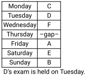Puzzle – Railway Reasoning (Part- 1)Total Questions: 5031. Five friends A, S, D, F and G took admission in a coaching institute in consecutive months of the same calendar year. A took admission in May. Only D took admission between F and S, while G took admission exactly one month after A.F was the last one to take admission. In which month did D take admission? [Group - D 17/08/2022 (Morning)](a) July(b) June(c) August(d) SeptemberCorrect Answer: (c) AugustSolution:As per the given instructions, we can arrange as follows. It is clear from the above arrangement D takes admission in August month.32. P. Q, R, S, T, U and V live on seven different floors of the same building. The lowermost floor in the building is numbered 1, the floor above it is number 2, and so on till the topmost floor is numbered 7. Q lives on floor number 2. R lives on the floor immediately above U's floor. S is on the floor immediately below V's floor. Only three persons live between the floors of T and P. R lives on the topmost floor. Only one person lives between the floors of R and P. On which floor does P live? [Group - D 17/08/2022 (Afternoon)](a) Floor 2(b) Floor 4(c) Floor 5(d) Floor 3Correct Answer: (c) Floor 5Solution:So, it is clear from the above figure that the floor on which P lives = 5.33. O, P, Q, R, S, T and U are seven boxes, which are placed one above the other, but not necessarily in the same order. Only one box is placed between R and P. Only one box is placed between S and T. Only one box is placed between P and Q . Q is placed at the bottom. T is placed immediately above Q . How many boxes are placed between S and Q ? [Group - D 17/08/2022 (Afternoon)](a) one(b) three(c) two(d) fourCorrect Answer: (c) twoSolution:34. Four friends Ramniwas, Ramesh, Ramsingh and Raman received their PhD degrees in consecutive months of the same calendar year. Ramniwas received his degree exactly one month prior to Ramsingh. Raman received his degree exactly one month after Ramesh. Ramniwas received his degree in September and Raman did not obtain his degree before Ramniwas. In which month did Ramesh receive his degree? [Group - D 17/08/2022 (Evening)](a) August(b) October(c) November(d) DecemberCorrect Answer: (c) NovemberSolution:Since Raman did not get his degree before Ramnivas, the correct sequence of people who got degree would be35. Each of W, X, Y, Z, A, B and C has a wedding to attend on a different day of a week starting from Monday to Sunday of the same week. C has to attend wedding immediately after A. Y has to attend a wedding on one of the days before B and W. Only Z has to attend a wedding before A. X has to attend a wedding on Friday. B does not have to attend a wedding on Sunday. On which day of the week does Y have to attend a wedding? [Group - D 17/08/2022 (Evening)](a) Saturday(b) Sunday(c) Wednesday(d) ThursdayCorrect Answer: (d) ThursdaySolution:We can arrange all 7 people in the following way.Hence we can see in the above table Y attend a wedding on Thursday.36. Six girls decided to record a video of their talks, one on each separate day of the same week. Sunday will be a rest day. P said Friday will suit her. U will start the process and record on Monday. S will record immediately before T. Q will record on a day exactly between the days of U and S. T selected Thursday. Which day is left for R to record the video? [Group - D 18/08/2022 (Morning)](a) Wednesday(b) Monday(c) Thursday(d) SaturdayCorrect Answer: (d) SaturdaySolution: After arranging in given order we get R record video on Saturday.37. P, Q, R, S, T, U and V live on seven different floors of the same building. The lowermost floor in the building is numbered 1, the floor above it is numbered 2, and so on till the topmost floor is numbered 7. U lives on the top floor. Only two persons live between T and Q . Q is on floor number 3. V lives on the floor immediately above P's floor. S lives on the floor immediately above R's floor. Q lives on the floor immediately below R's floor. Who lives on floor number 6 ? [Group - D 18/08/2022 (Morning)](a) T(b) V(c) R(d) SCorrect Answer: (a) TSolution:After arranging as per given instructionsTherefore, T lives on 6th floor38. G, H, I, J, K and L live on six different floors of the same building. The lowermost floor in the building is numbered 6, the floor above it is numbered 5, and so on till the topmost floor is numbered 1. J lives on an even numbered floor. G and K each live on an odd numbered floor. I lives on floor number 2. H lives on an odd numbered floor, immediately above L and immediately below I. G does not live on the topmost floor. Who lives on the lowermost floor? [Group - D 18/08/2022 (Afternoon)](a) J(b) K(c) L(d) GCorrect Answer: (a) JSolution:39. P, Q, R, S, T and U live on six different floors of the same building. The lowermost floor in the building is numbered 1, the floor above it is numbered 2, and so on till the topmost floor is numbered 6. Exactly three persons live between the floors of R and Q . T lives on the floor immediately above P's floor. U lives on the floor immediately above Q's floor. R lives on the floor immediately below S's floor. T lives on floor number 4. Q does not live on floor number 5. Who lives on floor number 6 ? [Group - D 22/08/2022 (Morning)](a) U(b) R(c) S(d) PCorrect Answer: (c) SSolution:We can see that from the above table that S lives on floor number 6.40. Each of A, B, C, D, E and F has an exam on a different day of a week starting from Monday and ending on Sunday of the same week. Thursday is the only gap day on which no exam is held. E’s exam is on Saturday. The exams of A and F are separated by one day that is the gap day. D’s exam is immediately before F but is immediately after C. B’s exam is on Sunday. On which day is D’s exam held? [Group - D 23/08/2022 (Morning)](a) Friday(b) Tuesday(c) Wednesday(d) MondayCorrect Answer: (b) TuesdaySolution:Submit Quiz« Previous12345Next »