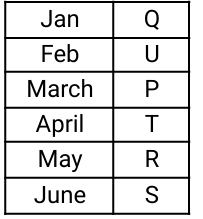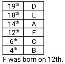 Puzzle – Railway Reasoning (Part- 2)Total Questions: 501. Eight boxes P, Q, R, S, T, U, V and W are kept one over the other, but not necessarily in the same order. V is fourth from the top and immediately below R. W is kept at the topmost position and immediately above P. Only one box is there between S and T. T is kept below S, and U is kept above Q . How many boxes are there between T and Q? [Group - D 25/08/2022 (Evening)](a) None(b) Two(c) Three(d) OneCorrect Answer: (a) NoneSolution:2. Six persons A, B, C, D, E and F, were born on different dates - 12th, 14th, 18th, 19th, 4th and 6th, of the same month. None of them were born after D and he was born just after E. Only three people were born before A. Only two people were born between C and E. B was not born after C. Who among the following was born on 12th? [Group - D 26/08/2022 (Morning)](a) B(b) F(c) C(d) ACorrect Answer: (b) FSolution:3. Each of P, Q, R, S, T and U has exam on different days of the week starting from Monday and ending on Saturday of the same week. R has exam on Tuesday. Only one student has exam between P and R. Q's exam is on the day immediately after P's. None of them has an exam before U, and S has an exam on the same day immediately after R. On which day T has exam? [Group - D 26/08/2022 (Afternoon)](a) Saturday(b) Thursday(c) Wednesday(d) FridayCorrect Answer: (a) SaturdaySolution:Now, from the above table, we can clearly see that T has his exam on Saturday.4. A, B, C, D, E and F are each allotted different days of the same week starting from Monday and ending on Saturday for their respective lectures. There is no lecture on Sunday. Being the senior most person, B is allotted the day of Saturday. Being the second senior most person, D is allotted the day of Friday. The youngest person C is allotted the day of Monday. Exactly three persons give their lecture before E. On what day is left for F to deliver the lecture? [Group - D 26/08/2022 (Afternoon)](a) Thursday(b) Wednesday(c) Monday(d) TuesdayCorrect Answer: (d) TuesdaySolution:Discrepancy has been found in this question.5. In a college, art room, library, gym, lab, storeroom, staffroom and classroom are located on seven different floors of the same building. The ground floor of the building is numbered 1, the floor above it is numbered 2. And similarly the number of the topmost floor is 7. There is no other floor below the library. And the library is just below the gym. There are only two floors between the gym and the classrooms. Both the lab and the staffroom are on even numbered floors. There are only three storeys between the storeroom and the art room. The storeroom is just below the lab. Which of the following is on floor number 4 ? [Group - D 26/08/2022 ( Evening)](a) Art room(b) Lab(c) Storeroom(d) StaffroomCorrect Answer: (b) LabSolution:As per the instructions given in the question, we can arrange all the 7 rooms in the following way. It can be clearly seen in the above picture that the lab is located on floor number 4.6. Each of D, E, G, H, S, T, and Y has an exam on a different day of a week starting from Monday and ending on Sunday of the same week. G's exam is on one of the days before H. E has the exam on Thursday. Only two person have exams between S and E. D has the exam on the day immediately after S. T has the exam on the day immediately before Y, but not on Saturday. G does not have the exam on Sunday. Who among the following has the exam on Friday? [Group - D 29/08/2022 (Morning)](a) Y(b) T(c) G(d) HCorrect Answer: (b) TSolution:As per given instructions in the question, we can arrange all persons in the following way.Hence it is clear from the figure that T has the exam on friday7. Five boxes G, T, Y, R and U are placed one over the other but not necessarily in the same order. Exactly two boxes are placed between T and Y but T is neither at the bottom nor at the top. What are the probable positions that T can take from the bottom? [Group - D 29/08/2022 (Morning)](a) Second and Third(b) First and Third(c) Second and Fourth(d) Third and FourthCorrect Answer: (c) Second and FourthSolution: Clearly from the above figure position of T from the bottom is second and fourth8. H, I, J, K, L, M and N are seven boxes that are kept one over the other but not necessarily in the same order. K is kept on one of the positions above L. Only one box is kept between K and L. J is kept immediately above M. H is kept immediately below L. Only two boxes are kept between M and H. Only one box is kept between L and N. How many boxes are kept between N and K ? [Group - D 29/08/2022 (Afternoon)](a) Four(b) Three(c) Two(d) OneCorrect Answer: (b) ThreeSolution:As per the instructions given in the question, we can arrange all the 7 boxes in the following way.There are three boxes between box N and box K.9. Each of R, S, T, U, V, W and X has duty as a cleaning agent on a different day of a week, starting from Monday to Sunday of the same week. X has duty on a day immediately before U. S and T have duties on one of the days before X. Only W has duty on the day between S and T. V has duty on Tuesday. Who has duty on Monday? [Group - D 29/08/2022 (Afternoon)](a) R(b) X(c) U`(d) SCorrect Answer: (a) RSolution:Hence, It is clear from the above arrangement that R has duty on Monday.10. Six persons, P, Q, R, S, T and U were born in different months of the same year, viz. January, February, March, April, May and June. U was born in the immediate next month of Q's birth month. R was born in May. P was not born in January. S was not born in April. Only one person was born between the months of P and R's birth months. In which month was T born? [ Group - D 29/08/2022 (Evening)](a) March(b) February(c) April(d) JuneCorrect Answer: (c) AprilSolution:As per given instructions, we can arrange it in the following way.Hence, we can see that T was born in april month.Submit Quiz12345Next »