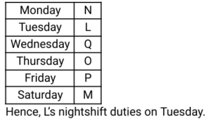 1. Each of the six security guards, L, M, N, O, P and Q, have their night shift duties on six different days of a week. starting from Monday and ending on Saturday of the same week, but not necessarily in the same order. L's nightshift duties are on the day immediately after N. O's nightshift duties are on the day immediately before P but it is not on Monday. M's nightshift duty is on Saturday. Q's nightshift duty is on Wednesday. Who among the following has nightshift duties on Tuesday? [Group - D 19/09/2022 (Evening)]