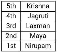 3. Five employees of the same company, Jagruti, Krishna, Laxman, Maya and Nirupam, live on five different floors of the same building. The lowermost floor in the building is numbered 1, the floor above it number 2, and so on till the topmost floor is numbered 5. Krishna and Nirupam live on the topmost and bottommost floors, respectively. Jagruti lives on the floor immediately above Laxman. Maya lives on the floor immediately above Nirupam. Who lives on the second floor? [Group - D 20/09/2022 (Afternoon)]