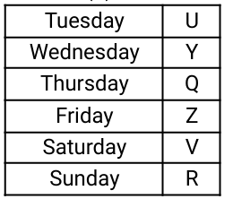 4. Each of the six students of class XII, Q, R, U, V, Y and Z, has an online medical entrance exam on a different day of a week, starting from Tuesday and ending on Sunday of the same week, but not necessarily in the same order. None of them have the exam before U. Y has the exam immediately after U. V has the exam on Saturday and Z has the exam immediately before V. Q does not have the exam on Sunday. Who among the following has the exam on Thursday? [Group - D 22/09/2022 (Morning)]