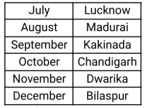 6. Six national mathematics lectures are planned on the eve of Mathematics Day in six cities - Madurai, DwarIka, Kakinada, Chandigarh, Lucknow and Bilaspur - on different months between July to December in the same year (but not necessarily in the same order). Only the Dwaraka lecture is planned between the Chandigarh and Bilaspur lectures. The Chandigarh lecture is in October. Only two lectures are planned before the Kakinada lecture. The Madurai lecture is immediately after the Lucknow lecture. Which city has the last lecture in the year? [Group - D 22/09/2022 (Afternoon)]