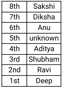 7. Eight people live on different floors of the same building. The lowermost floor in the building is numbered 1, the floor above it is numbered 2 and so on till the topmost floor is numbered 8. Only 4 people live above Aditya. Anu lives on the sixth floor. Only two people live between Anu and Shubham. Ravi lives immediately above Deep. Diksha lives immediately below Sakshi. Sakshi lives on the topmost floor. On which floor does Deep live? [Group - D 22/09/2022 (Evening)]