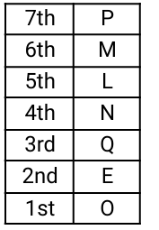 9. Seven boxes, L, M, N, O, P, Q and E, are kept one above the other but not necessarily in the same order. L. is fifth from the bottom in the stack. M is immediately above L. Only three boxes are there between O and L. Only two boxes are there between P and N. N is immediately above Q . P is at one of the positions above N. Which box is kept at the sixth position from bottom? [Group - D 26/09/2022 (Morning)]