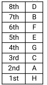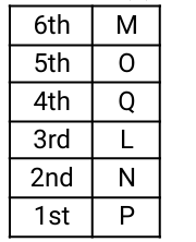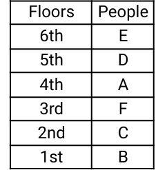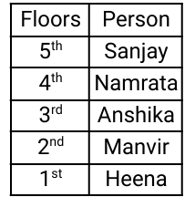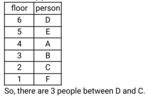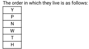 Puzzle – Railway Reasoning (Part- 3)Total Questions: 5021. H, N, P, T, W and Y live on six different floors of the same building. The lowermost floor in the building is numbered 1, the floor above it , number 2 and so on till the topmost floor is numbered 6. H lives on an odd numbered floor but not on floor number 3. Only two people live between H and N. P lives on an odd numbered floor above N. Only two people live between P and T. Neither T nor W lives on the topmost floor. How many people live below T ? [Group - D 06/10/2022 (Morning)](a) one(b) three(c) more than three(d) twoCorrect Answer: (a) oneSolution:According to the above sequence, only 1 person lives below T.22. Five boxes containing different fruits, namely strawberry, apple, litchi, cherry and pear, are kept one above the other, not necessarily in the same order. The strawberry box is in the exact middle of the stack. The pear box is immediately below the litchi box. Only the apple box is in between the cherry and strawberry boxes. The box at the bottom most position contains pears. Which box is second from the top? [Group - D 06/10/2022 (Afternoon)](a) Pear(b) Litchi(c) Cherry(d) AppleCorrect Answer: (d) AppleSolution:“Apple” is second from the top.23. Seven boxes M, N, O, P, Q, R and S are kept one over the other but not necessarily in the same order. Only three boxes are kept above P. Only two boxes are kept between P and M. Only R is kept between S and Q . Only N is kept between O and M. Neither Q nor M is at the top most position. Which box is kept between Q and O? [Group - D 06/10/2022 (Evening)](a) N(b) P(c) S(d) RCorrect Answer: (b) PSolution:According to the above sequence, “P” is kept between Q and O24. A, B, C. D. E and F live on six different floors of the same building. The lowermost floor in the building is numbered 1. the floor above it is numbere d 2, and so on till the topmost floor is numbered 6. B lives immediately below C. C lives on an even numbered floor but not on the topmost floor. Only three people live between B and D. A lives immediately above F. Who lives on floor number 4? [Group - D 06/10/2022 (Evening)](a) C(b) B(c) A(d) FCorrect Answer: (c) ASolution:So, according to the above sequence, “A” lives on the 4th floor.25. A, B, C, D, E, F, G and H live on eight different floors of the same building. The lowermost floor in the building is numbered 1, the floor above it, number 2 and so on till the topmost floor is numbered 8. D lives on an even numbered floor but does not live on floor number 4 or 2. Only five persons live between D and A. C lives immediately above A. H lives on floor number 1. Only B lives between the floors of F and D. E does not live on an even numbered floor. How many people live above E's floor? [Group - D 07/10/2022 (Morning)](a) 3(b) 4(c) 2(d) 1Correct Answer: (a) 3Solution: According to above sequence, 3 people live above E’s floor.26. Six friends L, M, N, O, P and Q live on six different floors of the same building. The lowermost floor in the building is numbered 1, the floor above it, number 2 and so on till the topmost floor is numbered 6. Only O lives on the floor between the floors of M and Q . Only N lives on the floor between the floors of L and P. Q lives on one of the floors above the floor of L. On which floor does O live? [Group - D 07/10/2022 (Morning)](a) 3rd(b) 4th(c) 5th(d) 2ndCorrect Answer: (c) 5thSolution:According to the above sequence, O lives on the 5th floor.27. Five friends live on five different floors of the same building. The lowermost floor in the building is numbered 1, the floor above it, number 2 and so on till the topmost floor is numbered 5. Sanjay lives on the floor immediately above Namrata. Anshika lives on the third floor. Heena lives on the lowermost floor. Namrata lives on the floor immediately above Anshika. Manvir lives on the floor immediately above Heena. Who lives on the topmost floor? [Group - D 07/10/2022 (Afternoon)](a) Heena(b) Manvir(c) Sanjay(d) NamrataCorrect Answer: (c) SanjaySolution:According to the above sequence, Sanjay lives on the topmost floor.28. Six students, Madhu, Anshul, Avani, Aarav, Priti, and Shikha, gave their presentations on different days in the month of March. The presentation was from 11th March to 16th March. Anshul presented on 14th March and Shikha presented immediately before Anshul. Only one person presented between Shikha and Priti. Shikha presented after Priti but before Avani. Avani presented immediately before Madhu. Who presented on 15th March? [Group - D 11/10/2022 (Morning)](a) Madhu(b) Aarav(c) Priti(d) AvaniCorrect Answer: (d) AvaniSolution: According to the above line, Avani presented on 15th March.29. A, B, C, D, E and F live on six different floors of the same building. The lowermost floor in the building is numbered 1, the floor above it, number 2 and so on till the topmost floor is numbered 6. C lives immediately above F, on an even numbered floor but not on the 6th floor. Only three people live between F and E. If B lives two floors below E, and A is not on the topmost floor, then how many people live exactly between D and C? [Group - D 11/10/2022 (Morning)](a) 2(b) 3(c) 4(d) 1Correct Answer: (b) 3Solution:30. Seven boxes S, T, U, V, W, X and Y are kept one over the other but not necessarily in the same order. X is kept immediately below V. Only two boxes are kept above U. T is kept immediately above S. U is kept immediately above V. Only two boxes are kept below X. How many boxes are below V? [Group - D 11/10/2022 (Afternoon)](a) One(b) Two(c) Four(d) ThreeCorrect Answer: (d) ThreeSolution:From the above table we can clearly see that, 3 boxes are below V.Submit Quiz« Previous12345Next »