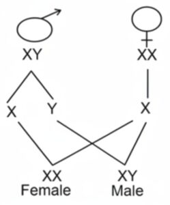 In male, sex chromosome is XY and in female sex chromosome is XX. In male gamete formation, half of the sperm contains X chromosome and the other half contains Y chromosome.