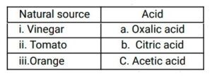 Citric Acid - It is a colourless weak organic acid. It occurs naturally in citrus fruits such as lemon, Orange, Grapefruit. Acetic Acid - it is a colorless liquid organic compound which is found in vinegar. Oxalic Acid - It is a crystalline solid that dissolves in water to give colorless, acidic solutions which is found in Pepper, Spinach, Tomato.
