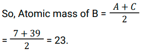 Solution:Dobereiner's law of triads - The atomic mass of the middle element of a triad is the arithmetic mean of the atomic masses of the other two elements. He identified 3 triads - 1st {Lithium (Li), Sodium (Na), Potassium (K)}, 2nd {Calcium (Ca), Strontium (Sr), Barium (Ba)}, 3rd {Chlorine (Cl), Bromine (Br), Iodine (I)}. Given, Atomic mass of A = 7 , Atomic mass of C = 39.