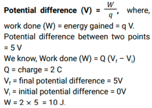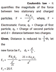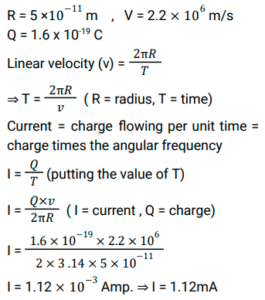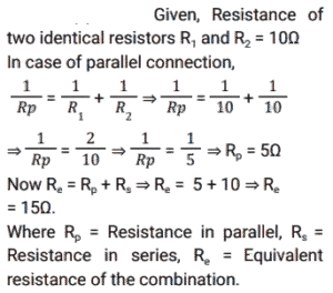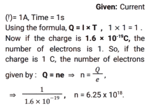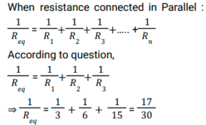 Railway Science (Physics-Electric Current and its Effects) (Part-IX)Total Questions: 3121. The resistors of values 3Ω, 6Ω and 15Ω are connected in parallel. What will be equivalent resistance in the circuit ? [RRB Group D 06/12/2018 (Morning)](a) 0.8(b) 1.4(c) 2.1(d) 1.7Correct Answer: (d) 1.7Solution:22. The boiling point of an alcohol is 78 °C. What is the temperature in Kelvin scale? [RRB ALP Tier - I (09/08/2018) Evening](a) 78K(b) 341K(c) 373K(d) 351KCorrect Answer: (d) 351KSolution:The relationship between Kelvin scale and Celsius scale of temperature can be written as: Temperature on kelvin scale = Temperature on Celsius scale + 273 Temperature on kelvin scale = 78 + 273 Temperature on kelvin scale = 351 k23. Two identical resistors, each of 10 Ω, are connected in parallel. This combination, in turn, is connected to a third resistor of 10 Ω. The equivalent resistance of the combination is_________. [RRB ALP Tier - I (13/08/2018) Morning](c) 15 Ω(a) 10 Ω(b) 30 Ω(d) 5 ΩCorrect Answer: (c) 15 ΩSolution:24. In a hydrogen atom, an electron moves in an orbit of radius 5.0 × 10⁻¹¹m with a speed of 2.2 × 10⁶ m/s. What is the equivalent current? (Electronic charge = 1.6 × 10⁻¹⁹ C) [RRB ALP Tier - I (14/08/2018) Afternoon](a) 1.12 mA(b) 0.112 mA(c) 112 mA(d) 11.2 mACorrect Answer: (a) 1.12 mASolution:25. If ‘I’ is the current through a wire and ‘e’ is the charge of an electron, then the number of electrons crossing in ‘t’ seconds will be given by: [RRB ALP Tier - I (17/08/2018) Morning](a) Ite(b) It/e(c) e/It(d) Ie/tCorrect Answer: (b) It/eSolution:26. Assuming that the charge of an electron is 1.6 x 10⁻¹⁹ C, the number of electrons passing through a section of wire per second when the wire carries a current of 1 A is: [RRB ALP Tier - I (17/08/2018) Evening](a) 0.625 × 10¹⁷(b) 1.6 × 10¹⁹(c) 6.25 × 10¹⁸(d) 1.6 × 10⁻¹⁹Correct Answer: (c) 6.25 × 10¹⁸Solution:27. If two Coulomb of charge flows through any cross-section of a conductor in one second, what will be the current flowing through it? [RRB ALP Tier - I (20/08/2018) Morning](a) 1/2 Ampere(b) 1 Ampere(c) 1/4 Ampere(d) 2 AmpereCorrect Answer: (d) 2 AmpereSolution:I = 𝑄/t where I = Current, Q = charge, t = time; ⇒ I = 𝑄/t = 2/1 = 2 Ampere28. A charge of 2 C passes from one point to the other in a circuit. If the potential difference between the two points is 5 V, the amount of work done is: [RRB ALP Tier - I (21/08/2018) Afternoon](a) 10 J(b) 0.4 J(c) 2.5 J(d) 5 JCorrect Answer: (a) 10 JSolution:The amount of work done to move a unit charge from a point to another point in a space where an electric field is present is called the electric potential difference.29. Two particles with charges q₁ and q₂ are kept at a certain distance to exert force F on each other. If the distance is reduced to one-fifth, then the force between them is: [RRB ALP Tier - I (30/08/2018) Morning](a) 𝐹/5(b) 𝐹/25(c) 5𝐹(d) 25 FCorrect Answer: (d) 25 FSolution:30. An electric lamp of 100 W is used for 5 hours per day. How much energy will be consumed by the lamp in 3 days? [RRB ALP Tier - I (30/08/2018) Afternoon](a) 1.5 units(b) 0.5 units(c) 5.0 units(d) 1.0 unitsCorrect Answer: (a) 1.5 unitsSolution:Power of lamp = 100w = 100/1000 = 0.1Kw, time = 5 hrs × 3 days = 15 hrs. Consumed electrical energy = power × time, E = 0.1kw × 15h = 1.5 kw-h = 1.5 units. Therefore, the electric lamp will consume 1.5 kilowatt-hours of energy in 3 days.Submit Quiz« Previous1234Next »