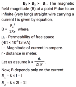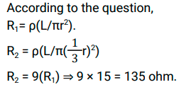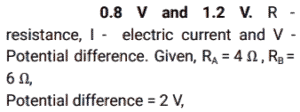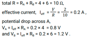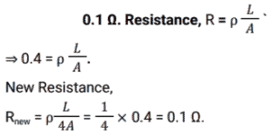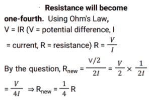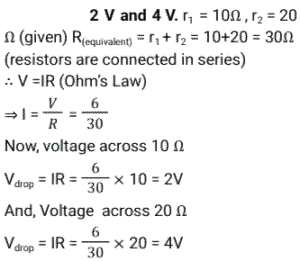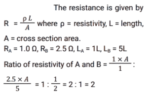 Railway Science (Physics-Electric Current and its Effects) (Part-VI)Total Questions: 5021. Two identical bulbs are connected in parallel to a battery of 4 V. If the current in the circuit is 0.2 A, the power dissipated by the battery is: [RRC Group D 08/09/2022 (Morning)](a) 20 W(b) 0.8 W(c) 10 W(d) 0.05 WCorrect Answer: (b) 0.8 WSolution:We know, Power is given as the product of voltage and current. So, P = V × I. Given Voltage = 4 V, I = 0.2 A P = 4 × 0.2 = 0.8 Watt.22. Two identical resistors are connected in parallel to a 6 V battery. The total power dissipated in the circuit is 12 W. The current in each resistor is: [RRC Group D 08/09/2022 (Afternoon)](a) 4.0 A(b) 2.0 A(c) 0.5 A(d) 1.0 ACorrect Answer: (d) 1.0 ASolution:Power, P = V × I where, V = Voltage and I = Current Current in the circuit, I = p/v = 12/6 = 2 A Since, current across each identical resistors in parallel combination gets equally divided So, Iᵣ = 1A23. Consider two wires, A and B, of same thickness but lengths L and 5L, respectively. If the resistances of A and B are 1.0Ω and 2.5Ω , respectively, the ratio of the resistivity of A to the resistivity of B is: [RRC Group D 08/09/2022 (Afternoon)](a) 1/2(b) 1(c) 5(d) 2Correct Answer: (d) 2Solution:24. A 4Ω resistor, A. is connected in series to a 6Ω resistor, B, and a 2 V battery. The potential drops across A and B are respectively_____________. [RRC Group D 08/09/2022 (Evening)](a) 0.6 V and 1.4 V(b) 1.2 V and 0.8 V(c) 1.4 V and 0.6 V(d) 0.8 V and 1.2 VCorrect Answer: (d) 0.8 V and 1.2 VSolution:25. Resistance of a conducting wire is 15 ohm. If another wire of the same material and length but having one-third radius is taken, then the resistance of the second wire will be ___. [RRC Group D 09/09/2022 (Evening)](a) 45 ohm(b) 5 ohm(c) 60 ohm(d) 135 ohmCorrect Answer: (d) 135 ohmSolution:Formula used, R = ρL/A where, R (resistance of the wire), ρ (resistivity of the material of wire), L (length of the wire) and A (cross sectional area of the wire).26. The resistance of a wire of length L and area of cross-section A is 0.4Ω. The resistance of a wire of the same material, of the same length (L) and area of cross-section 4A will be: [RRC Group D 12/09/2022 (Morning)](a) 0.2 Ω(b) 0.8 Ω(c) 1.6 Ω(d) 0.1 ΩCorrect Answer: (d) 0.1 ΩSolution:27. A copper wire AB is made of three parts, AC, CD and DB of resistances in the ratio of 2:3:4. The wire is connected to a battery. If V₁. V₂ and 𝑉₃ are the potential drops across AC, CD and DB, respectively, then which of the following is correct? [RRC Group D 12/09/2022 (Afternoon)](a) 𝑉₁ : 𝑉₂ : 𝑉₃ = 1 : 1 : 1(b) 𝑉₁ : 𝑉₂ : 𝑉₃ = 2 : 3 : 4(c) 𝑉₁ : 𝑉₂ : 𝑉₃ = 3 : 4 : 2(d) 𝑉₁ : 𝑉₂ : 𝑉₃ = 1: 2 : 3Correct Answer: (c) 𝑉₁ : 𝑉₂ : 𝑉₃ = 3 : 4 : 2Solution:As per Ohm’s Law, V = IR. All three parts of wire (AC, CD, DB) can be considered to be connected in series. Therefore, Current = constant and voltage drop will be directly proportional to their resistances.28. A 10Ω resistor, A, is connected in series to a 20Ω resistor, B, and a 6V battery. The potential drops across A and B are respectively___________. [RRC Group D 12/09/2022 (Evening)](a) 2 V and 4 V(b) 4 V and 2 V(c) 1 V and 5 V(d) 3 V and 3 VCorrect Answer: (a) 2 V and 4 VSolution:29. If current is doubled and potential difference is reduced to half, then_______ [RRC Group D 13/09/2022 (Morning)](a) resistance will be halved(b) resistance will become four times(c) resistance will become one-fourth(d) resistance will be doubledCorrect Answer: (c) resistance will become one-fourthSolution:30. The magnitudes of the magnetic field at a point at distance r from a straight conductor carrying current I, 2I and 3I, one by one, are B₁, B₂ and 𝐵₃ , respectively. Which of the following relations is correct? [RRC Group D 13/09/2022 (Afternoon)](a) 𝐵₁ = 𝐵₂ = 𝐵₃(b) 𝐵₁ > 𝐵₂ > 𝐵₃(c) 𝐵₃ > 𝐵₂ > 𝐵₁(d) 𝐵₂ > 𝐵₃ > 𝐵₁Correct Answer: (c) 𝐵₃ > 𝐵₂ > 𝐵₁Solution:Submit Quiz« Previous12345Next »