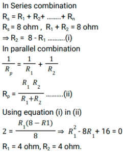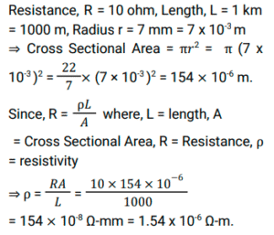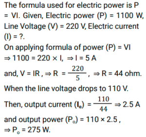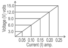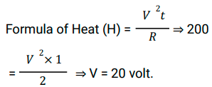 Railway Science (Physics-Electric Current and its Effects) (Part-VII)Total Questions: 5021. The current (I) flowing through an electric circuit of resistance 10 ohm is 5 amp. What is the heat generated per second? [RRC Group D 26/09/2022 (Afternoon)](a) 250 joule(b) 50 joule(c) 250 calorie(d) 50 calorieCorrect Answer: (a) 250 jouleSolution:According to Joules law of Heating, H = I²Rt. Where I is current, R is resistance and t is time. Given R = 10 Ω, I = 5 A. Then heat generated per second is H = 5² × 10 × 1 = 250 joule.22. A battery of 12V supplies a current of 3 A to a lamp connected to it. The energy supplied to it in 15 minutes will be: [RRC Group D 26/09/2022 (Evening)](a) 32000 J(b) 32150 J(c) 32400 J(d) 540 JCorrect Answer: (c) 32400 JSolution:The energy supplied to the lamp can be calculated using the formula: Energy = Power × Time. Now, Power = Voltage × Current = 12V × 3A = 36W. The time for which the energy is supplied is 15 minutes, which is equivalent to 900 seconds. Substituting these values in the formula for energy, we get: Energy = Power × Time = 36W × 900s = 32,400 J23. If the current flowing through a resistance of 5 ohm is 6 amp, then the current flowing through another resistance of 10 ohm connected in series to it is_________ [RRC Group D 27/09/2022 (Morning)](a) 0 amp(b) 12 amp(c) 3 amp(d) 6 ampCorrect Answer: (d) 6 ampSolution:In parallel connection, Voltage remains constant throughout the circuit while for series connection, Current remains constant throughout the circuit.24. The potential difference across a resistor of 2 ohm when 200 joule of heat is produced each second is given by_______. [RRC Group D 27/09/2022 (Evening)](a) 40 volt(b) 80 volt(c) 20 volt(d) 10 voltCorrect Answer: (c) 20 voltSolution:Given Heat (H) = 200 J, time (t) = 1 second and Resistance = 2 Ω.25. In an electrical circuit, five identical bulbs are connected in parallel to each other to a battery of 20 V (negligible internal resistance). When all the five bulbs glow, a current of 5 A is recorded. Then the power dissipated in the circuit and the resistance of each bulb are _______ and _______ respectively. [RRC Group D 27/09/2022 (Evening)](a) 56.25 W, 2.25 Ω(b) 31.25 W, 1.25 Ω(c) 46.25 W, 1.85 Ω(d) 38.75 W, 1.55 ΩCorrect Answer: (b) 31.25 W, 1.25 ΩSolution:The resistance of one bulb is R. So total resistance of 5 bulb = R/5 In the given electrical circuit Given V = 20 v, Total current I = 5 A According to ohm law V = IR ⇒ 20 = 5 R , R = 4 Ω ⇒ so resistance of each bulb Rₒₙₑ = Total bulb/R = 5/4 = 1.25 Ω Power in Circuit P = I²R ⇒ (5)² (1.25) = 31.25 W26. The power of an electric equipment through which a charge of 15 coulomb is flowing per 5 seconds when it is connected to a 20 V source is ______. [RRC Group D 28/09/2022 (Afternoon)](a) 1500 calorie(b) 60 calorie(c) 60 watt(d) 1500 wattCorrect Answer: (c) 60 wattSolution:Q= I × T Where Q = charge per second, I = current, T = time Q = 15 coulomb, T= 5 sec. 15 = I × 5 I = 3 A Now, P = VI Where P = power, V = voltage, I = current P = 20 × 3 = 60 Watts.27. Heating device of power 1100 W is designed to operate at 220 V line voltage. If on a particular day the line voltage drops to 110 V, then the current through it and its output power will be _______ and _______. [RRC Group D 29/09/2022 (Afternoon)](a) 10 A, 275 W(b) 5A, 550 W(c) 10 A, 550W(d) 2.5 A, 275 WCorrect Answer: (d) 2.5 A, 275 WSolution:28. Find the resistance of the conductor using the given graph. [RRC Group D 29/09/2022 (Afternoon)](a) 600 ohm(b) 0.24 ohm(c) 0.016 ohm(d) 60 ohmCorrect Answer: (d) 60 ohmSolution:From Ohm's law, the resistance of a conductor is given as V = IR Hence, it is the slope of the V-I curve. So resistance at any point on the graph will be ⟹ R = 3 - 0 / 0.05-0.00 ⟹ 60 Ω29. The net resistance of two resistors R₁ and R₂ connected in series is 8 ohm and their net resistance in parallel is 2 ohm. What are the values of individual resistances R₁ and R₂ , respectively? [RRC Group D 29/09/2022 (Evening)](a) 8 ohm; 0 ohm(c) 6 ohm; 2 ohm(d) 2 ohm; 6 ohm(b) 4 ohm; 4 ohmCorrect Answer: (b) 4 ohm; 4 ohmSolution:30. The length of a conducting wire is 1 km and its radius of cross section is 7 mm. A resistor of resistance 10 Ω is made out of this wire. The resistivity of this conductor will be________ [RRC Group D 30/09/2022 (Afternoon)](a) 1.54 × 10⁻⁶Ω-m(b) 7 × 10⁻⁶Ω-m(c) 1 × 10⁻⁶Ω-m(d) 2.22 × 10⁻⁶Ω-mCorrect Answer: (a) 1.54 × 10⁻⁶Ω-mSolution:Submit Quiz« Previous12345Next »