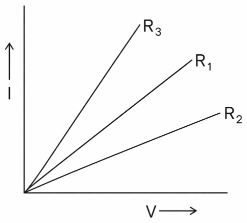 3. The I-V graph of three resistances R₁ , R₂ and R₃, is shown in the figure below. The correct relation between R₁ R₂ and 𝑅₃ is: [RRC Group D 17/08/2022 (Afternoon)]