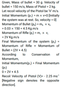 Railway Science (Physics-Force and Pressure) (Part-IV)Total Questions: 5021. A car falls off the side of the road and hits the ground in 0.5 s. If g is equal to 10 ms⁻² , what is its speed when it hits the ground? [RRB Group D 03/10/2018 (Evening)](d) 5 ms⁻¹(a) 10 ms⁻²(b) 10 ms⁻¹(c) 5 ms⁻²Correct Answer: (d) 5 ms⁻¹Solution:Given that, Acceleration, a = g = 10 ms⁻² , Time of fall, t = 0.5 s Let, initial velocity, u = 0 Now, Speed on striking the ground, v = u + at = 0 + 10 × 0.5 = 5.0 ms⁻¹.22. The mass of an object is 20 kg. What would its weight be on Earth ? (take g = 10 ms⁻²) [RRB Group D 03/10/2018 (Evening)](a) 200 kg(b) 200 W(c) 200 Pa(d) 200 NCorrect Answer: (d) 200 NSolution:Given, m = 20 kg. W = m × g ⇒ W = 20 × 10 = 200 N.23. The speed of a car increases uniformly from 18 kmh⁻¹ to 36 kmh⁻¹ in 5s. Calculate the acceleration of the car. [RRB Group D 04/10/2018 (Morning)](a) 4 ms⁻²(b) 1 ms⁻²(c) 4 ms²(d) 1 ms²Correct Answer: (b) 1 ms⁻²Solution:Given that, Initial velocity (u) = 18 km/hr = 5 m/s, Final velocity (v) = 36 km/hr = 10 m/s, Time (t) = 5 sec Using the first equation of motion, v = u+ at ⇒ 10 = 5 + a (5) ⇒ a = 1 m/sec².24. A 20 g bullet with a velocity of 150 ms⁻¹ is fired horizontally from a 2.5 kg pistol. What is the recoil velocity of the pistol? [RRB Group D 04/10/2018 (Afternoon)](a) -1.2 ms⁻¹(b) -1.5 ms⁻¹(c) -2.0 ms⁻¹(d) -1.25 ms⁻¹Correct Answer: (a) -1.2 ms⁻¹Solution:25. The weight of an object on the earth is 200 N and mass is 20 kg. What is the value of acceleration due to gravity given? [RRB Group D 05/10/2018 (Morning)](a) 9.8 m/s²(b) 10 m/s²(c) 10 m/s⁻²(d) 9.8 m/s⁻²Correct Answer: (b) 10 m/s²Solution:Weight = mass х acceleration due to gravity, Given , Weight = 200 N and Mass = 20 kg. Then, Acceleration due to gravity = 200/10 = 10 m/s².26. A bullet, of mass 20 g is horizontally fired with a velocity 150 ms⁻¹ from a pistol of mass 3 kg. What is the recoil velocity of the pistol? [RRB Group D 05/10/2018 (Morning)](a) -1.5ms⁻¹(b) - 2.0ms⁻¹(c) -1.0ms⁻¹(d) -1.25ms⁻¹Correct Answer: (c) -1.0ms⁻¹Solution:The recoil velocity of the pistol can be calculated using the following equation : m₁(mass of the bullet) × v₁ (velocity of the bullet)= m₂ (mass of the pistol) × v₂(velocity of the pistol). (0.020 kg) × (150 ms⁻¹) = (3 kg) × v₂ ⇒ v₂ = 1.0 ms⁻¹ Therefore, the recoil velocity of the pistol is - 1.0 ms⁻¹ (The recoil velocity is in the opposite direction of the velocity of the bullet).27. The weight of an object on earth is 60 N. What would be its weight on the Moon ? [RRB Group D 05/10/2018 (Afternoon)](a) 10 N(b) 10 kg(c) 60 kg(d) 60 NCorrect Answer: (a) 10 NSolution:Given that, the weight of the object on the earth surface (Wₑ)= 60 N. We know that, Weight of the object on the moon (Wₘ) = 1/6 × Wₑ = 1/6 × 60 = 10 N.28. A 25 g bullet is fired horizontally with a velocity of 150 ms⁻¹ from a pistol of 2 kg. What is the expected velocity of the pistol ? [RRB Group D 05/10/2018 (Afternoon)](a) - 1.25 ms⁻¹(b) - 1.5 ms⁻¹(c) - 2.0 ms⁻¹(d) - 1.87 ms⁻¹Correct Answer: (d) - 1.87 ms⁻¹Solution:Given : Mass of the bullet (m) = 25 grams = 0.025 kg, Velocity of bullet (v) = 150 m/s, Mass of the pistol (M)= 2 kg, Velocity of pistol (V) = ? ∵ Initial momentum of the system is ‘0’ as it is at rest. After firing, V= - 𝑚𝑣/m = - 0.025 × 150/ = 2 = - 1.87 ms⁻¹.29. A bullet, of mass 30 g is horizontally fired with a velocity 150 ms ⁻¹ from a pistol of mass 2 kg. What is the recoil velocity of the pistol? [RRB Group D 05/10/2018 (Evening)](a) - 2.25 ms⁻¹(b) - 1.25 ms⁻¹(c) - 1.5 ms⁻¹(d) - 1.0 ms⁻¹Correct Answer: (a) - 2.25 ms⁻¹Solution:30. The weight of an object on the earth is 200 N. What is its mass (g = 10 ms⁻²)? [RRB Group D 05/10/2018 (Evening)](a) 20 kg(b) 20 C(c) 20 Pa(d) 20 NCorrect Answer: (a) 20 kgSolution:Given : Weight of Object = 200 N, Acceleration due to gravity = 10 m/s². ∵ Weight of the Object = Mass ×Acceleration due to gravity Mass = 𝑊𝑒𝑖𝑔ℎt/𝐴𝑐𝑐𝑒𝑙𝑒𝑟𝑎𝑡𝑖𝑜𝑛 𝑑𝑢𝑒 𝑡𝑜 𝑔𝑟𝑎𝑣𝑖𝑡y = 200/10 = 20 kg.Submit Quiz« Previous12345Next »