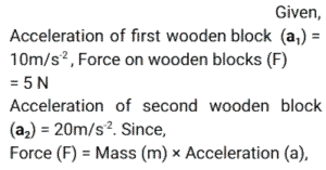 Railway Science (Physics-Force and Pressure) (Part-V)Total Questions: 2321. If a force of 20N is applied on a body with a mass of 10kg, what will be the acceleration produced? [RRB ALP Tier - I (29/08/2018) Morning](a) 200m/sec²(b) 2m/sec²(c) 100m/sec²(d) 5m/sec²Correct Answer: (b) 2m/sec²Solution:Force = Mass × Acceleration = m × a Force has magnitude as well as direction. It is a vector quantity. Force = 20 N , Mass= 10 kg Acceleration = ? 20 = 10 × a ⇒ a = 2 m/sec²22. When a force of 10 N acts on a body of mass of 10 kg that is able to move freely, which of the following statements will apply? [RRB ALP Tier - I (29/08/2018) Evening](a) The body moves with an acceleration of 1 ms⁻²(b) The body moves with a speed of 1 m/s(c) The body moves with a speed of 1 km/s(d) The body moves with an acceleration of 10 𝑚𝑠⁻²Correct Answer: (a) The body moves with an acceleration of 1 ms⁻²Solution:Newton's Second law, Force (F) = Mass (m) × acceleration The force acting on the body (F) = 10 N, Mass of the body (m) = 10 kg, Acceleration of the body (a) = ? F = ma ⇒ a = 𝐹/m ,a = 10/10 = 1 m/s².23. A wooden block of mass m₁ kg accelerates at 10 ms⁻² when a force of 5 N acts on it. Another block of mass m₂ kg accelerates at 20 ms⁻² when the same force acts on it. If both the blocks are tied together and the same force acts on their combination, the acceleration will be about: [RRB ALP Tier - I (30/08/2018) Morning](a) 4.67 ms⁻²(b) 6.67 ms⁻²(c) 1.67 ms⁻²(d) 5.67 ms⁻²Correct Answer: (b) 6.67 ms⁻²Solution:Submit Quiz« Previous123