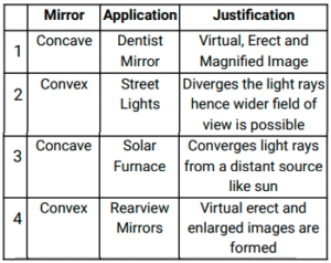 Solution:Only 1, 2 and 3. Uses of Convex mirror: sunglasses, rear-view mirror in Automobiles, utilized in ATMs and other places for security reasons, reflector for street lights. Uses of concave mirror: Shaving mirrors, Head mirrors, Ophthalmoscope, Astronomical telescopes, Headlights, Solar furnaces. The image formed by a convex mirror is located behind the mirror, always a virtual and erect image and reduced in size.