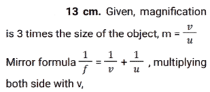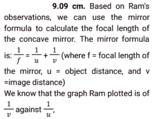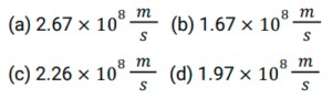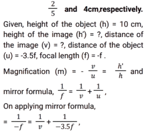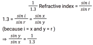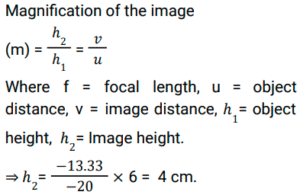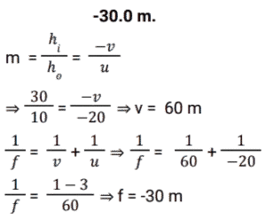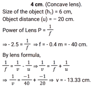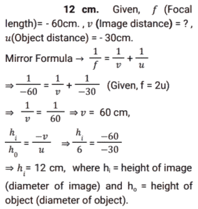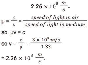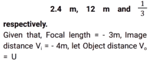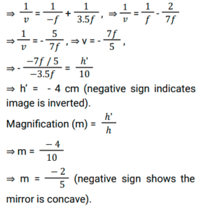 Railway Science (Physics-Light and Optics) (Part-VII)Total Questions: 5031. A stalactite of size 10.0 m is found in Brazil. If this stalactite is placed at a distance of 20.0 m from a concave mirror and a real image of size 30.0 m is formed, then the principal focus of the mirror is at: [RRC Group D 26/09/2022 (Morning)](a) - 30.0 m(b) - 15.0 m(c) + 30.0 m(d) + 15.0 mCorrect Answer: (a) - 30.0 mSolution:32. A needle of height 6 cm is placed at a distance of 20 cm in front of a lens with a power of -2.5 D. The height of the image of the needle will be: [RRC Group D 26/09/2022 (Morning)](a) 4 cm(b) 6 cm(c) 7 cm(d) 5 cmCorrect Answer: (a) 4 cmSolution:33. If light enters from air to some medium A having a refractive index of 1.33, then what is the speed of light in the medium A? [RRC Group D 26/09/2022 (Evening)](a)(b)(c)(d)Correct Answer: (c)Solution:34. A light ray is travelling from air medium to water medium (refractive index = 1.3) such that angle of incidence is x degree and angle of refraction is y degree. The value of ratio (sin y)/(sin x) is: [RRC Group D 26/09/2022 (Evening)](a) 0.3(b) 1/1.3(c) 1.3(d) 1Correct Answer: (b) 1/1.3Solution:35. A coin of diameter 10 cm is placed at a distance 3.5f from the pole of a concave mirror of focal length f. The linear magnification and the diameter of the image are: [RRC Group D 27/09/2022 (Morning)](a) 2/5 and 4cm respectively(b) 1/5 and 2 cm, respectively(c) 3/5 and 5cm, respectively(d) 4/8 and 8cm, respectivelyCorrect Answer: (a) 2/5 and 4cm respectivelySolution:36. Refractive index of flint glass is 1.56. Then the critical angle(πΌπ) for glass air interface can also be expressed as Sin πΌπ equals: [RRC Group D 27/09/2022 (Afternoon)](a) 0.64(b) 0.94(c) 0.74(d) 0.84Correct Answer: (a) 0.64Solution:Critical angle = 1/πππππππ‘ππ£π ππππx= 1/1.56 = 0.64 The ratio between the speed of light in vacuum to speed of light in a medium is the refractive index (ΞΌ or n).37. An ice-ball of 6 cm diameter is placed 30 cm in front of a concave mirror and its principal focus is double the distance of the object. Following the new Cartesian sign convention, the diameter of the image is: [RRC Group D 27/09/2022 (Afternoon)](a) 14 cm(b) 12 cm(c) 16 cm(d) 10 cmCorrect Answer: (b) 12 cmSolution:38. Suppose Ram has placed a ball in front of a concave mirror of focal length (f) at various distances (u) and he has measured the corresponding image distances (v). From the values of u and v. Ram is able to plot a graph of 1/v against I/u. From the graph, Ram has observed that x intercept and y intercept are 0.1 cm and 0.11 cm, respectively. Then the focal length of the mirror is: [RRC Group D 27/09/2022 (Evening)](a) 12.65 cm(b) 8.5 cm(c) 9.09 cm(d) 11.25 cmCorrect Answer: (c) 9.09 cmSolution:39. In the Leviathan telescope in Ireland, a concave mirror of focal length 3.0 m is used. If an image of height 80 cm is formed at a distance of 4.0 m, then the object height, object distance and magnification are (the object is placed in front of the mirror): [RRC Group D 27/09/2022 (Evening)](a) 2.4 m, 12 m and 1/3 respectively(b) 2.4 m, 6 m and 1/3 respectively(c) 1.2 m, 12 m and 1/3 respectively(d) 2.4 m, 12 m and 1/2 respectivelyCorrect Answer: (a) 2.4 m, 12 m and 1/3 respectivelySolution:40. A concave mirror forms a real image of three times the size of an object on a screen. The object and screen are then moved until the image is six times the size of the object. If the shift of the screen is 39 cm, then the focal length of the mirror is: [RRC Group D 28/09/2022 (Morning)](a) 26 cm(b) 10 cm(c) 13 cm(d) 39 cmCorrect Answer: (c) 13 cmSolution:Submit Quiz« Previous12345Next »