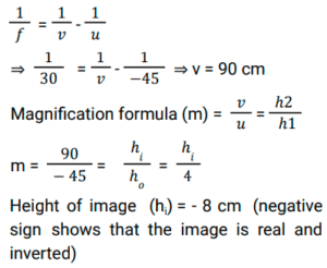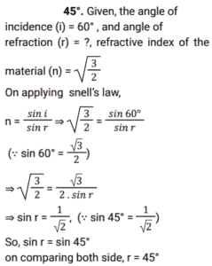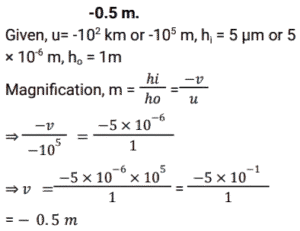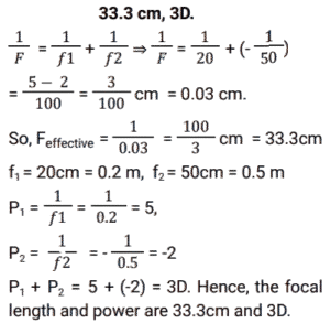 Railway Science (Physics-Light and Optics) (Part-VII)Total Questions: 5041. A ray of light is traveling from medium A to medium B. The incident ray makes an angle 75° with respect to the normal, and the refracted ray makes an angle 40° with respect to the normal. The refractive index of the medium A relative to the medium B is: [RRC Group D 28/09/2022 (Morning)](a) 0.67(b) 1.34(c) 1.50(d) 0.87Correct Answer: (a) 0.67Solution:0.67. Refractive Index = 𝑠𝑖𝑛 r/𝑠𝑖𝑛 i (From medium A to B ) Refractive index = 𝑠𝑖𝑛 40/ 𝑠𝑖𝑛 75 = 0.67.42. If a coin is placed at the bottom of a tumbler of height 30 cm filled with water of refractive index 1.33, then the apparent depth of the coin appears to be: [RRC Group D 28/09/2022 (Evening)](a) 39.9 cm(b) 25.7 cm(c) 36.7 cm(d) 22.6 cmCorrect Answer: (d) 22.6 cmSolution:22.6 cm. Given, real depth = 30 cm, apparent depth = ? and n = 1.33 Refractive index (n) = 𝑟𝑒𝑎𝑙 𝑑𝑒𝑝𝑡ℎ/𝑎𝑝𝑝𝑎𝑟𝑒𝑛𝑡 𝑑𝑒𝑝𝑡ℎ , ⇒ 1.33 = 30/𝑎𝑝𝑝𝑎𝑟𝑒𝑛𝑡 𝑑𝑒𝑝𝑡ℎ , ⇒ apparent depth = 30/1/33 , ⇒ 22.6 cm.43. A doublet is a combination of two lenses. One such doublet is made with a convex lens of focal length of 20 cm and a concave lens of focal length of 50 cm. The effective focal length and power of this doublet is ______and________ respectively. [RRC Group D 29/09/2022 (Morning)](a) 50 cm, 2D(b) 33.3 cm, 3D(c) 14.28 cm, 7D(d) 20 cm, 5DCorrect Answer: (b) 33.3 cm, 3DSolution:44. A ray of light in air is incident at an angle of 60° on the surface separating air from a medium of refractive index √(3/2) The ray is refracted in the medium at an angle of___________. [RRC Group D 29/09/2022 (Afternoon)](a) 45°(b) 15°(c) 60°(d) 30°Correct Answer: (a) 45°Solution:45. A coin of diameter 4 cm is placed at a distance of 45 cm in front of a convex lens of focal length 30 cm. Then the diameter of the image of the coin will be: [RRC Group D 29/09/2022 (Evening)](a) 10 cm(b) 8 cm(c) 6 cm(d) 12 cmCorrect Answer: (b) 8 cmSolution:8 cm. Given, Height of object (hₒ) = 4cm, Object distance (u) = - 45 cm, focal length (f) = 30 cm. Formula used, Lens formula,46. Suppose a satellite is 10² km above the ground and it is used to take high resolution images of objects. If a concave mirror is used to form a primary image of an object of size 1.0 m and if the image size is 5 μm and it is inverted, then the principal focus of the concave mirror should be: [RRC Group D 30/09/2022 (Afternoon)](a) +1.0 m(b) +0.50 m(c) −1.0 m(d) −0.5 mCorrect Answer: (d) −0.5 mSolution:Here, Object distance > Image distance, we can say that the object was at infinity with respect to image. So, in such cases the image will form on focus. So, focal length = image distance = - 0.5 m.47. The refractive index of a diamond is 2.42. Then the speed of light in the diamond is: [RRC Group D 06/10/2022 (Evening)](a) 2.48 × 10⁸ m/s(b) 1.24 × 10⁸ m/s(c) 3 × 10⁸ m/s(d) 1.72 × 10⁸ m/sCorrect Answer: (b) 1.24 × 10⁸ m/sSolution:We know that refractive index (n) = c/v = (speed of light in vaccum)/(speed of light in diamond) ⇒ 2.42 = (3 × 10⁸)/v ⇒ v = 1.24 × 10⁸ m/s48. Suppose Raghu has kept an object in front of a concave mirror of focal length (f) at various distances (u) and he has measured the corresponding image distances (v). From such an experiment, Raghu is able to plot a graph of u against 1/magnification, i.e. u vs. 1/m. Which of the following options is true? [RRC Group D 06/10/2022 (Evening)](a) It is a straight line with slope +f, and x intercept +1 and y intercept −f(b) It is a straight line with slope −1/f, and x intercept +1 and y intercept −f(c) It is a straight line with slope 1/f, and x intercept −1 and y intercept +f(d) It is a straight line with slope +f, and x intercept −1 and y intercept +fCorrect Answer: (d) It is a straight line with slope +f, and x intercept −1 and y intercept +fSolution:In a concave mirror, when the distance of the object is less than the focal length, the magnification will be greater than one. When we place the object on the centre of curvature, magnification will be 1. When we move away from the mirror, magnification will be less than 1.49. Ram has a corrective lens of power − 6.5 D. The focal length of the lens is: [RRC Group D 07/10/2022 (Evening)](a) −13.76 cm(b) 15.38 cm(c) +13.76 cm(d) −15.38 cmCorrect Answer: (d) −15.38 cmSolution:The power of a lens is defined as the reciprocal of its focal length in meters. Since P = 1/f ⇒ f = 1/D = 1/-6.5 = - 0.1538 meters = -0.1538 × 100 = - 15.38 cm.50. If a lens has a focal length of 25 cm, what will be the power of that lens? [RRB NTPC CBT - I ( 10/02/2021 ) Evening](a) 4D(b) 2D(c) 1D(d) 6DCorrect Answer: (a) 4DSolution:Power of lens (Dioptre) D = 1/focal length(f) F = 25 cm = 0.25m D = 1/0.25m = 4DSubmit Quiz« Previous12345