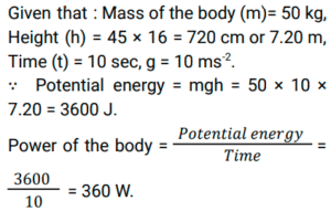 Solution:Given : Mass (m) = 50 kg, Height of each stair = 15 cm = 0.15 m, Number of stairs = 43, Total height = 0.15 m Γ 43 = 6.45 m.