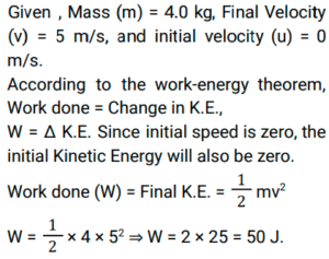 1. A body of 4.0 kg is lying at rest. Under the action of a constant force, it gains a speed of 5 m/s. The work done by the force will be_________ . [RRB ALP Tier - I (09/08/2018) Afternoon]