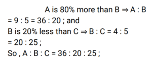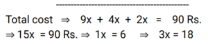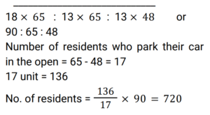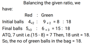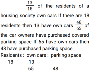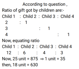 Ratio & Proportion (Railway Maths) (Part – II)Total Questions: 501. If (a + b) : (b + c) : (c + a) is 6 : 7 : 8 and also a + b + c = 14. Then what is the value of c? [NTPC CBT - I 10/01/2021 (Evening)](a) 6(b) 8(c) 12(d) 10Correct Answer: (a) 6Solution:2. Ajay, Sunil, Krishna and Sumit are good friends. They rent a house together at Rs 15,000 per month. Ajay lives in this house for only 15 days in a month. Krishna and Sumit are also working and they decide to jointly contribute Rs 10,000 as their share of the rent. Sunil lives in the house for the whole month. If Ajay and Sunil decide to contribute to the rent based on the number of days they live in the house, what would be the share of rent paid by Ajay, Sunil, Sumit and Krishna respectively? [NTPC CBT - I 11/01/2021 (Morning)](a) 1/3 1/3 1/9 2/9(b) 1/9 2/9 1/3 1/3(c) 1/9 1/3 1/3 2/9(d) 1/3 1/3 1/4 1/4Correct Answer: (b) 1/9 2/9 1/3 1/3Solution:3. If the ratio of the 11th term of an AP to its 18th term is 2 : 3, find the ratio of the sum of its first five terms to the sum of its first 10 terms. [NTPC CBT - I 12/01/2021 (Evening)](a) 17 : 6(b) 5 : 4(c) 1 : 2(d) 6 : 17Correct Answer: (d) 6 : 17Solution:4. If A is 80% more than B and B is 20% less than C , then what will be the value of A : B : C ? [NTPC CBT - I 18/01/2021 (Evening) ](a) 36 : 20 : 25(b) 36 : 5 : 20(c) 20 : 25 : 36(d) 36 : 25 : 20Correct Answer: (a) 36 : 20 : 25Solution:5. 13/18 of the residents of a housing society own cars and 48/65 of the car owners have purchased covered parking space. If 136 of the residents parked in the open, how many residents were there in the society ? [NTPC CBT - I 31/01/2021 (Morning) ](a) 650(b) 720(c) 630(d) 900Correct Answer: (b) 720Solution:6. In a carton containing a dozen mirrors is dropped, which of the following can be the ratio of number of broken mirrors to unbroken mirrors? [NTPC CBT - I 09/02/2021 (Morning)](a) 3 : 7(b) 3 : 2(c) 4 : 7(d) 5 : 1Correct Answer: (d) 5 : 1Solution:1 dozen = 12 article Only option (d) is possible because the sum option (5 : 1) is equal to 12.7. Which of these sets of numbers are in continued proportion? [RRB JE 02/06/2019 (Afternoon)](i) 0.4, 3.6, 3.24(ii) 7, 21, 63(iii) 2.4, 9.6, 38.4(a) (i), (ii) and (iii)(b) (i) and (ii)(c) (ii) and (iii)(d) (ii) onlyCorrect Answer: (c) (ii) and (iii)Solution:8. In a bag, the ratio of red balls to green balls is 4 : 9. If 7 more red balls are added to the bag, the ratio of red balls to green balls will become 5 : 6. How many green balls are there in the bag? [ALP Tier - I 14/08/2018 (Evening)](a) 12(b) 27(c) 9(d) 18Correct Answer: (d) 18Solution:9. Pen, Pencil, and Eraser in a box are in the ratio 3 : 2 : 1. If the prices of pen, pencil and eraser are 3 Rs, 2 Rs and 2 Rs respectively, and if the cost of the box is 90 Rs, then find the number of pens in the box. [RPF Constable 17/01/2019 (Morning)](a) 17(b) 19(c) 16(d) 18Correct Answer: (d) 18Solution:10. Aamir distributed 875 gifts among 4 children. The part of the first child is twice the portion of the other child, three times the size of the third child, and four times the fourth child's share. Show the sum of the total gifts received by the first and the second child. [RPF S.I. 05/01/2019 (Morning)](a) 610(b) 630(c) 620(d) 640Correct Answer: (b) 630Solution:Submit Quiz12345Next »