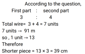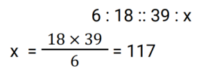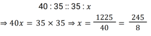 Ratio & Proportion (Railway Maths) (Part – II)Total Questions: 5011. If 6, 18, 39, and x are in proportion, then find the value of x. [Group D 17/08/2022 (Morning)](a) 117(b) 112(c) 139(d) 115Correct Answer: (a) 117Solution:12. If a : b = 2 : 3 and b : c = 3 : 4, then a : b : c = ? [Group D 17/08/2022 (Evening)](a) 3 : 4 : 2(b) 2 : 4 : 3(c) 2 : 3 : 4(d) 3 : 2 : 4Correct Answer: (c) 2 : 3 : 4Solution:13. If the difference between two numbers is 52 and they are in the ratio 7 : 3, then find the greater of the two numbers. [Group D 18/08/2022 (Morning)](a) 84(b) 65(c) 91(d) 70Correct Answer: (c) 91Solution:14. Two boxes have chocolates in the ratio 7 : 5. If the difference in the number of chocolates is 28, find the number of chocolates in the box with larger numbers. [Group D 18/08/2022 (Morning)](a) 77(b) 84(d) 91(c) 98Correct Answer: (c) 98Solution:15. If 40 : 35 :: 35 : x, find the value of x. [Group D 18/08/2022 (Evening)](a) 245/8(b) 49/16(c) 49/14(d) 49/8Correct Answer: (a) 245/8Solution:16. A 91 cm-long wire is cut into two pieces so that one piece length is three-fourth of the other. Find the length of the shorter piece. [Group D 22/08/2022 (Morning)](a) 42.17 cm(b) 39 cm(c) 36.23 cm(d) 38 cmCorrect Answer: (b) 39 cmSolution:17. Two numbers are in the ratio 5 : 3. If the difference between the numbers is 54, then find the smaller number. [Group D 22/08/2022 (Afternoon)](a) 91(b) 135(c) 81(d) 115Correct Answer: (c) 81Solution:18. The mean proportional between the numbers p and q is 8. Which of the following pairs of numbers can be the values of p and q. [Group D 22/08/2022 (Afternoon)](a) 12 and 3(b) 16 and 4(c) 12 and 16(d) 10 and 6Correct Answer: (b) 16 and 4Solution:19. The mean proportional of 16 and 144 is [Group D 22/08/2022 (Afternoon)](a) 44(b) 36(c) 48(d) 34Correct Answer: (c) 48Solution:20. The third proportional of 10 and 50 is. [Group D 24/08/2022 (Morning) ](a) 300(b) 1250(c) 250(d) 125Correct Answer: (c) 250Solution:Submit Quiz« Previous12345Next »
