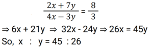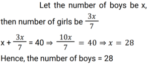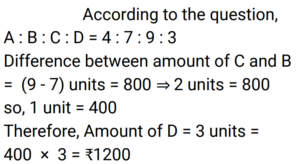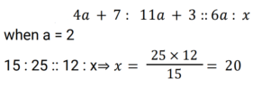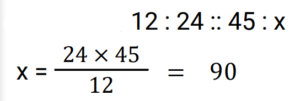 Ratio & Proportion (Railway Maths) (Part – II)Total Questions: 5021. Find the fourth proportional of 12, 24 and 45. [Group D 24/08/2022 (Afternoon)](a) 90(b) 25(c) 30(d) 60Correct Answer: (a) 90Solution:22. If a / b = 4 / 3 and 3a + 2b = 24, then find the value of a. [Group D 24/08/2022 (Afternoon)](a) 4(b) 13/3(c) 5(d) 16/3Correct Answer: (d) 16/3Solution:23. If x : y = 7 : 3, then (x² + y²) : (x² - y²) = ? [Group D 25/08/2022 (Morning) ](a) 29 : 20(b) 25 : 4(c) 5 : 2(d) 5 : 1Correct Answer: (a) 29 : 20Solution:24. Find the fourth proportional of 4a + 7, 11a + 3 and 6a, if a = 2. [Group D 25/08/2022 (Afternoon)](a) 20(b) 15(c) 30(d) 25Correct Answer: (a) 20Solution:25. An amount is divided between two friends in the ratio 2 : 5. If the second part is ₹6 more than the first, then the initial amount is : [Group D 25/08/2022 (Afternoon)](a) ₹13(b) ₹12(c) ₹23(d) ₹14Correct Answer: (d) ₹14Solution:26. Find the mean proportional between 17 and 68. [Group D 25/08/2022 (Evening)](a) 46(b) 42(c) 34(d) 38Correct Answer: (c) 34Solution:27. A sum of money is distributed among four persons A, B, C and D in the ratio 4 : 7 : 9 : 3. If C gets ₹800 more than B, then find the amount that D gets. [Group D 26/08/2022 (Morning)](a) ₹1,000(b) ₹1,500(c) ₹1,400(d) ₹1,200Correct Answer: (d) ₹1,200Solution:28. If (2x + 7y) : (4x - 3y) :: 8 : 3, then find the value of x : y. [Group D 26/08/2022 (Afternoon)](a) 45 : 26(b) 20 : 19(c) 11 : 13(d) 26 : 45Correct Answer: (a) 45 : 26Solution:29. In a class there are 40 students (only boys and girls). The number of girls is three-sevenths of the number of boys. Find the number of boys in the class. [Group D 29/08/2022 (Afternoon)](a) 28(b) 12(c) 24(d) 32Correct Answer: (a) 28Solution:30. The ratio of the number of boys to that of the girls in a school is 7 : 9. If the number of girls in the school is 189, then the number of boys in that school is : [Group D 29/08/2022 (Evening)](a) 168(b) 126(c) 147(d) 105Correct Answer: (c) 147Solution:Submit Quiz« Previous12345Next »