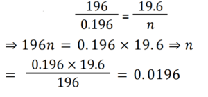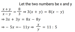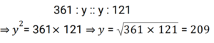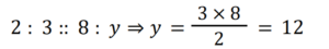 Ratio & Proportion (Railway Maths) (Part – II)Total Questions: 5041. Two numbers are in the ratio 7 : 5. If their sum is 360, then the difference between them is : [Group D 08/09/2022 (Afternoon)](a) 60(b) 70(c) 90(d) 80Correct Answer: (a) 60Solution:42. If 63 chocolates are to be divided between A and B in the ratio 4 : 5, then how many chocolates will B get? [Group D 13/09/2022 (Afternoon)](a) 35(b) 49(c) 28(d) 27Correct Answer: (a) 35Solution:43. The ratio of the sum of two numbers and their difference is 8 : 3. The ratio of the greater number to the smaller number is : [Group D 13/09/2022 (Afternoon)](a) 5 : 11(b) 11 : 5(c) 12 : 7(d) 7 : 12Correct Answer: (b) 11 : 5Solution:44. The ratio of Kamal’s to Kiran’s age is 4 : 5. Kamal will be 30 years old after 6 years. What is the present age of Kiran? [Group D 13/09/2022 (Evening)](a) 28 years(b) 30 years(c) 40 years(d) 24 yearsCorrect Answer: (b) 30 yearsSolution:45. If 13 : 12 :: x : 60, then the value of x is : [Group D 13/09/2022 (Evening)](a) 91(b) 65(c) 78(d) 56Correct Answer: (b) 65Solution:46. If 196 / 0.196 = 19.6 / n, then the value of n = _______. [Group D 14/09/2022 (Afternoon)](a) 0.0196(b) 0.00196(c) 1.96(d) 0.196Correct Answer: (a) 0.0196Solution:47. If 2, 3, 8 and y are in proportion, find the value of y. [Group D 14/09/2022 (Evening)](a) 48(b) 12(c) 24(d) 16Correct Answer: (b) 12Solution:48. If 361 : y :: y : 121, and y > 0, then the value of y is : [Group D 15/09/2022 (Evening)](a) 247(b) 381(c) 121(d) 209Correct Answer: (d) 209Solution:49. If ₹1,368 is divided into two parts in the ratio of 5 : 3, then the amount (in Rs.) in the greater part is __________. [Group D 16/09/2022 (Morning)](a) 855.00(b) 585.00(c) 268.00(d) 444.72Correct Answer: (a) 855.00Solution:Let the greater part be 5x and smaller part be 3x So, Amount in greater part = 5/8 × 1368 = ₹ 855.0050. If 14 : y :: 7 : 8, find the value of y. [Group D 16/09/2022 (Evening)](a) 16(b) 18(c) 56(d) 28Correct Answer: (a) 16Solution:14 : y :: 7 : 8 ⇒ y = 14 × 8 / 7 = 16Submit Quiz« Previous12345