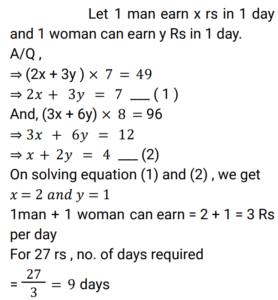 9. 2 men and 3 women can earn Rs. 49 in 7 days. 3 men and 6 women can earn Rs. 96 in 8 days. In what time 1 man and 1 woman earn Rs. 27? [RRB NTPC 14/03/2021 (Morning)]