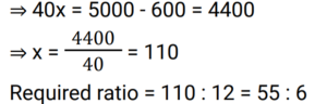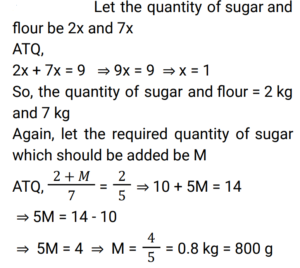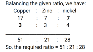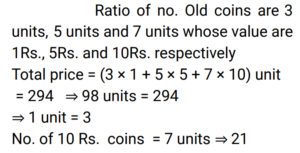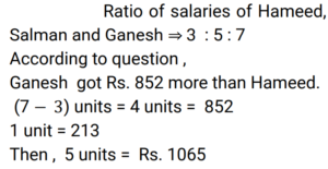 Ratio & Proportion (Railway Maths) (Part – VII)Total Questions: 5031. The salaries of Hameed, Salman and Ganesh are in the ratio 7 : 11 : 9. If Ganesh gets ₹ 852 more than Hameed, then what is Salman’s salary (in Rupees)? [RPF S.I. 06/01/2019 (Afternoon) ](a) 1,065(b) 1,035(c) 1,055(d) 1,045Correct Answer: (a) 1,065Solution:32. Amir distributed 775 gifts among 4 children. The share of the first child is twice that of the second child, thrice that of the third child and four times that of the fourth child. Find the total number of gifts received by the first and second child. [RPF S.I. 10/01/2019 (Morning) ](a) 558(b) 554(c) 556(d) 552Correct Answer: (a) 558Solution:33. In one box, three different types of old coins are in the ratio of 3: 5: 7, the value of old coins is 1 rupees, 5 rupees, and 10 rupees respectively. If the total value of old coins in the box is Rs 294, then tell the number of old coins of Rs 10. [RPF S.I. 10/01/2019 (Morning) ](a) 22(b) 24(c) 21(d) 23Correct Answer: (c) 21Solution:34. There are saplings of 361 Mango tree and Neem tree in a garden. The ratio of the number of Mango tree to that of Neem tree saplings is 8 : 11. Then how many Neem tree saplings are in the garden? [RRB ALP 09/08/2018 (Afternoon)](a) 57(b) 209(c) 152(d) 171Correct Answer: (b) 209Solution:35. The ratio of sand to gravel in a mixture is 17 : 8, while that between gravel and cement is 6 : 17. What is the ratio of sand to cement in the mixture? [RRB ALP 09/08/2018 (Evening)](a) 3 : 4(b) 17 : 17(c) 289 : 48(d) 8 : 6Correct Answer: (a) 3 : 4Solution:Ratio of sand and cement in the mixture = 17 × 6 / 8 × 17 = 3/436. In an alloy of German silver the ratio of copper to zinc was 17 : 7 while that of nickel to zinc was 4 : 3. The ratio of copper to zinc to nickel in the alloy was: [RRB ALP 10/08/2018 (Afternoon) ](a) 51: 21: 28(b) 17 : 21 : 4(c) 68 : 28 : 21(d) 17: 28 : 3Correct Answer: (a) 51: 21: 28Solution:37. The ratio of the heights of Nani and Leelu is 4 : 3. If Leelu is 1.2 m tall, then what is the height of Nani ? [RRB ALP 10/08/2018 (Evening) ](a) 0.9 m(b) 2m(c) 1.6 m(d) 1.8 mCorrect Answer: (c) 1.6 mSolution:38. Vishnu spends ₹ 5000 in buying 12 tables and some chairs. The cost of one table is ₹ 50 and that of one chair is 40. What is the ratio of the numbers of the chairs to the number of tables purchased ? [RRB ALP 13/08/2018 (Morning) ](a) 55 : 4(b) 5 : 1(c) 5 : 2(d) 55 : 6Correct Answer: (d) 55 : 6Solution:39. In a bag containing red, green and pink tokens, the ratio of red to green tokens was 5 : 12 while the ratio of pink to red tokens was 7 : 15. What was the ratio of green to pink tokens? [RRB ALP 13/08/2018 (Morning)](a) 36 : 7(b) 25 : 28(c) 12 : 7(d) 28 : 25Correct Answer: (a) 36 : 7Solution:Balancing the given ratio we have : Red : Green = 5 : 12 × 3 = 15 : 36 Red : Pink = 15 : 7 So, the ratio of Red, Green and Pink token = 15 : 36 : 7 Required ratio = 36 : 740. The initial ratio of sugar to flour in a dough was 2 : 7. To 9 kg of the dough, John added more sugar to make the sugar to flour ratio 2 : 5. How much sugar did John later add? [RRB ALP 13/08/2018 (Afternoon)](a) 1.2 kg(b) 750 g(c) 800 g(d) 1 kgCorrect Answer: (c) 800 gSolution:Submit Quiz« Previous12345Next »