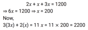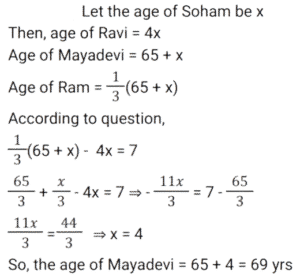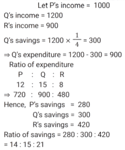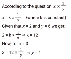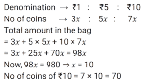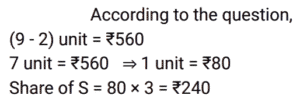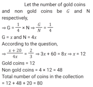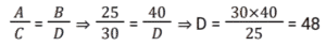 Ratio & Proportion (SSC) (Part-2)Total Questions: 5011. If 𝓍 varies inversely as y and 𝓍 = 2 when y = 2, then the value of y when 𝓍 = 3 is : [SSC CGL 09/09/2024 (2nd Shift)](a) 2(b) 3(c) 4(d) 6Correct Answer: (c) 4Solution:12. The ages of two friends, Ram and Ravi, differ by 7 years. Ram’s mother Mayadevi is three times as old as Ram, and Ravi is four times as old as his brother Soham. The ages of Mayadevi and Soham differ by 65 years. Find the age of Mayadevi (in years). [SSC CGL 10/09/2024 (1st Shift)](a) 69(b) 36(c) 85(d) 45Correct Answer: (a) 69Solution:13. What is the value of D, if A : C = B : D in the given table? [SSC CGL 10/09/2024 (1st Shift)](a) 56(b) 48(c) 45(d) 42Correct Answer: (b) 48Solution:According to question, 14. A money bag contains one rupee, 5 rupee and 10 rupee coins in the ratio of 3 : 5 : 7 respectively. If the total amount in the bag is ₹980, then find the number of coins of ₹10. [SSC CGL 10/09/2024 (1st Shift)](a) 69(b) 70(c) 71(d) 68Correct Answer: (b) 70Solution:15. A sum of money is divided among P, Q, R and S in the proportion of 4 : 9 : 2 : 3. If Q gets ₹560 more than R, then the share of S is: [SSC CGL 11/09/2024 (1st Shift)](a) ₹140(b) ₹340(c) ₹240(d) ₹440Correct Answer: (c) ₹240Solution:16. The incomes of P, Q and R are in the ratio 10 : 12 : 9 and their expenditures are in the ratio 12 : 15 : 8. If Q saves 25% of his income, then what is the ratio of the savings of P, Q and R ? [SSC CGL 12/09/2024 (1st Shift)](a) 15 : 14 : 21(b) 14 : 15 : 21(c) 21 : 15 : 14(d) 21 : 14 : 15Correct Answer: (b) 14 : 15 : 21Solution:17. Raj divides ₹1,200 in the ratio 2 : 1 : 3 among three of his friends. The amount equal to the sum of three times the largest share and two times the smallest share is: [SSC CGL 12/09/2024 (1st Shift)](a) ₹2,40(b) ₹1,800(c) ₹2,200(d) ₹2,000Correct Answer: (c) ₹2,200Solution:18. The ratio between male and female members in a club is 2 : 3. If the number of male members is increased by 200, the ratio becomes 5 : 6. How many female members are there in the club? [SSC CGL 12/09/2024 (2nd Shift)](a) 1200(b) 900(c) 1400(d) 1000Correct Answer: (a) 1200Solution:19. Find the mean proportional of 12.96 and 0.16. [SSC CGL 13/09/2024 (3rd Shift)](a) 1.21(b) 1.96(c) 1.44(d) 1.69Correct Answer: (c) 1.44Solution:20. In a collection of rare coins, there is one gold coin for every four non-gold coins. If 20 more gold coins are added to the collection, the ratio of the number of gold coins to that of non-gold coins will be 2:3. The total number of coins in the collection will now become ________. [SSC CGL 17/09/2024 (1st Shift)](a) 80(b) 60(c) 100(d) 48Correct Answer: (a) 80Solution:Submit Quiz« Previous12345Next »