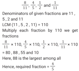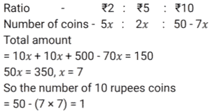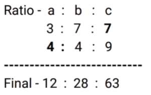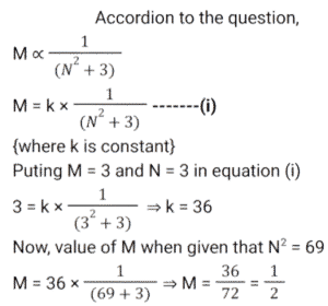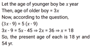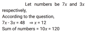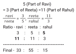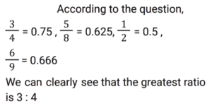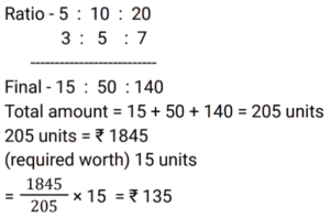 Ratio & Proportion (SSC) (Part-2)Total Questions: 5031. Radhika requested the cashier of a bank to get her coins in lieu of her cheque worth ₹1,845. Cashier gave her a packet containing ₹5, ₹10 and ₹20 coins in the ratio of 3 : 5 : 7. What is the total worth of the smallest coin received by her ? [SSC CHSL 01/07/2024 (1st Shift)](a) ₹135(b) ₹125(c) ₹145(d) ₹105Correct Answer: (a) ₹135Solution:32. The age of the older of two boys is thrice that of the younger. 9 years ago it was five times that of the younger. Find the present age of each. [SSC CHSL 01/07/2024 (2nd Shift)](a) 15 years, 45 years(b) 18 years, 54 years(c) 17 years, 51 years(d) 12 years, 36 yearsCorrect Answer: (b) 18 years, 54 yearsSolution:33. P pays Q a sum of ₹150 using coins of ₹2, ₹5 and ₹10. He uses a total of 50 coins. If the ratio of ₹2 and ₹5 coins used is 5 : 2, then how many coins of ₹10 are used in the payment? [SSC CHSL 01/07/2024 (3rd Shift)](a) 2(b) 1(c) 4(d) 5Correct Answer: (b) 1Solution:34. In what ratio must a grocer mix two varieties of pulses costing ₹60 and ₹75 per kg, respectively, so as to get a mixture worth ₹65 per kg ? [SSC CHSL 01/07/2024 (3rd Shift)](a) 3 : 4(b) 2 : 1(c) 2 : 3(d) 1 : 2Correct Answer: (b) 2 : 1Solution:35. M varies inversely as (N² + 3). If M = 3 when N = 3, then what will be the value of M when N² = 69 ? [SSC CHSL 01/07/2024 (4th Shift)](a)(b)(c)(d)Correct Answer: (d)Solution:36. The difference between two numbers is 48. The ratio of these two numbers is 7 : 3. What is the sum of the two numbers ? [SSC CHSL 01/07/2024 (4th Shift)](a) 110(b) 100(c) 90(d) 120Correct Answer: (d) 120Solution:37. Divide some money in the ratio Ravi, Reeta and Rahul that 5 (Part of Ravi) = 3 (Part of Reeta) = 11 (Part of Rahul). The money ratio of Ravi : Reeta : Rahul is equal to : [SSC CHSL 02/07/2024 (4th Shift)](a) 11 : 5 : 3(b) 11 : 33 : 15(c) 5 : 11 : 3(d) 33 : 55 : 15Correct Answer: (d) 33 : 55 : 15Solution:38. Among the ratios 3 : 4, 5 : 8, 1 : 2, 6 : 9 which is the greatest? [SSC CHSL 03/07/2024 (1st Shift)](a) 5 : 8(b) 6 : 9(c) 1 : 2(d) 3 : 4Correct Answer: (d) 3 : 4Solution:39. If a : b = 3 : 7 and b : c = 4 : 9, then find a : b : c. [SSC CHSL 03/07/2024 (2nd Shift)](a) 12 : 28 : 63(b) 3 : 28 : 63(c) 12 : 28 : 9(d) 3 : 28 : 9Correct Answer: (a) 12 : 28 : 63Solution:40. Which is the greatest ratio among the following? [SSC CHSL 03/07/2024 (3rd Shift)](a) 4/5(b) 8/11(c) 1/2(d) 1/11Correct Answer: (a) 4/5Solution:Submit Quiz« Previous12345Next »