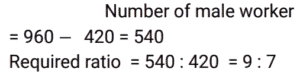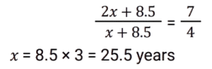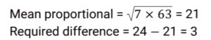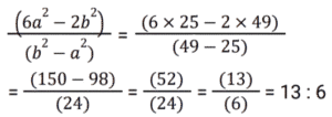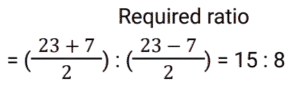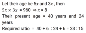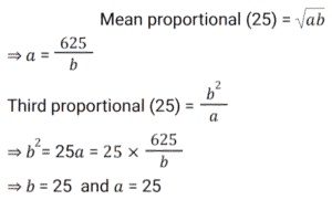 Ratio & Proportion (SSC) (Part-4)Total Questions: 5011. Find 2 numbers such that their mean proportional is 25 and their third proportional is 25. [SSC CHSL 07/08/2023 (1st Shift)](a) 5 and 5(b) 5 and 25(c) 25 and 125(d) 25 and 25Correct Answer: (d) 25 and 25Solution:12. The present age of a father is twice that of his son. 8.5 years hence the ratio would be 7 : 4. Find the son's present age. [SSC CHSL 07/08/2023 (2nd Shift)](a) 25.5 years(b)16.5 years(c) 20.5 years(d) 24.6 yearsCorrect Answer: (a) 25.5 yearsSolution:13. The sum of the amount that Sunaina and Ranjan have is ₹23 and the difference of their amount is ₹7. The ratio of the amount that Sunaina and Ranjan have is:- [SSC CHSL 07/08/2023 (3rd Shift)](a) 5 : 3(b) 7 : 15(c) 15 : 8(d) 2 : 17Correct Answer: (c) 15 : 8Solution:14. Two numbers are in the ratio of 1 : 2. If 7 is added to both, their ratio changes to 3 : 5. The greater number is: [SSC CHSL 07/08/2023 (3rd Shift)](a) 30(b) 18(c) 14(d) 28Correct Answer: (d) 28Solution:15. The difference between 24 and the mean proportional of 7 and 63 is: [SSC CHSL 07/08/2023 (4th Shift)](a) 3(b) 2(c) 5(d) 4Correct Answer: (a) 3Solution:16. If a : b = 5 : 7, then (6a² - 2b²) : (b² - a²) will be : [SSC CHSL 08/08/2023 (4th Shift)](a) 12 : 5(b) 21 : 5(c) 13 : 6(d) 17 : 8Correct Answer: (c) 13 : 6Solution:17. What is the fourth proportional of 3√5, 5√8 and 3√10 ? [SSC CHSL 09/08/2023 (4th Shift)](a) 10√5(b) 40√2(c) 30(d) 20Correct Answer: (d) 20Solution:18. The ratio of the father's age to his son's age is 5 : 3. The product of the numbers representing their ages is 960.The ratio of their ages after 6 years will be: [SSC CHSL 11/08/2023 (1st Shift)](a) 23:15(b) 23:17(c) 21:15(d) 21:17Correct Answer: (a) 23:15Solution:19. Find the third proportion of P and 12, when 8, P, 16 and 18 are in proportion. [SSC CHSL 11/08/2023 (2nd Shift)](a) 16(b) 8(c) 18(d) 12Correct Answer: (a) 16Solution:20. The total number of workers in a company is 960. If the number of female workers in the company is 420, then the respective ratio of the total number of male workers to the total number of female workers in the company is: [SSC CHSL 11/08/2023 (3rd Shift)](a) 7 : 9(b) 16 : 9(c) 16 : 7(d) 9 : 7Correct Answer: (d) 9 : 7Solution:Submit Quiz« Previous12345Next »